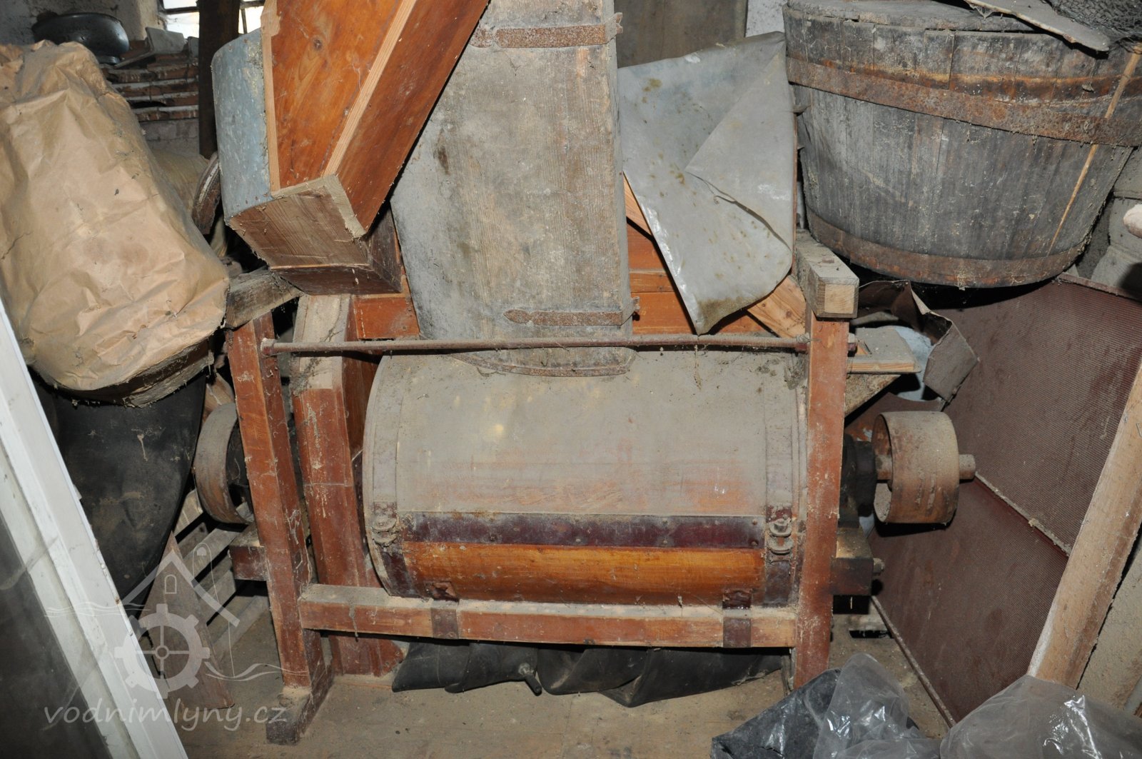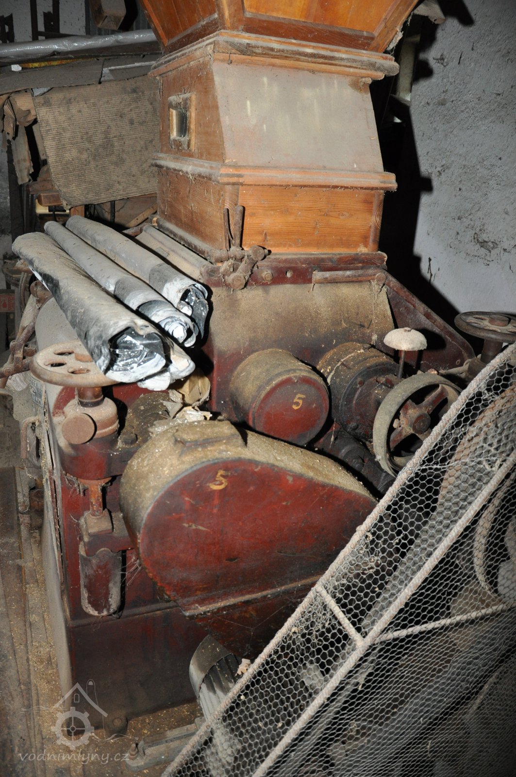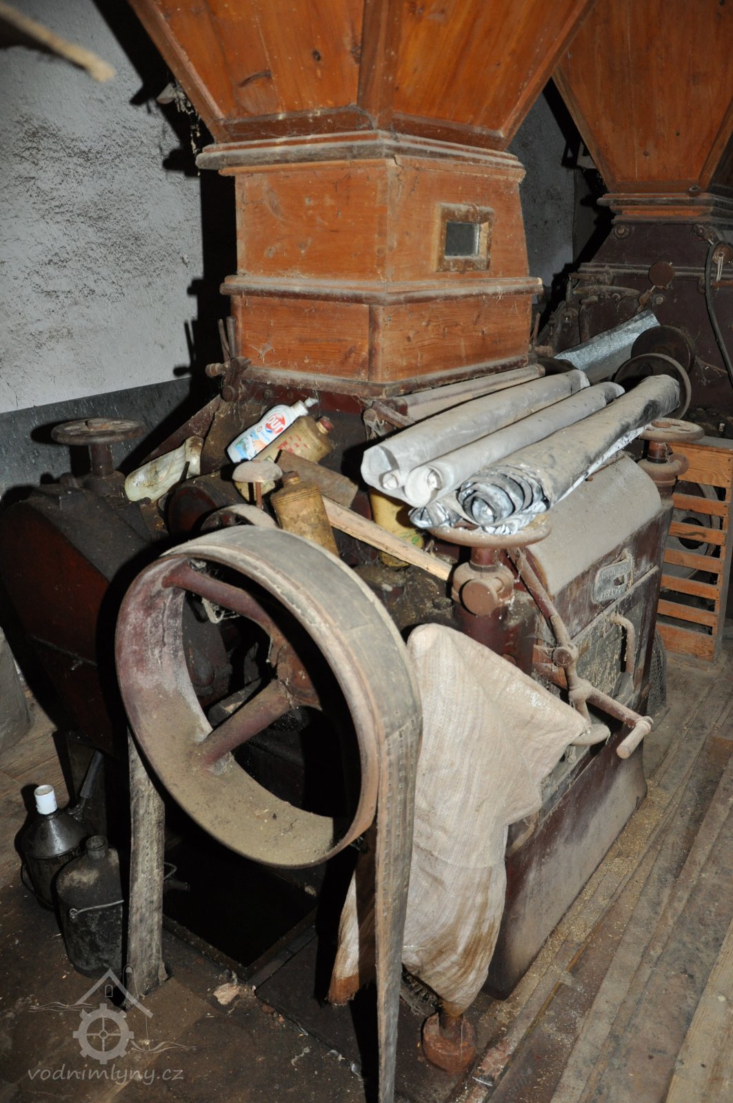 válcová stolice tuplovka výrobce Hugo Greffenius - Frankfurt nad Mohanem (vzácné), 2015, © David Veverka, (Prvky na obrázku: válcová stolice, zásobník, násypka)
