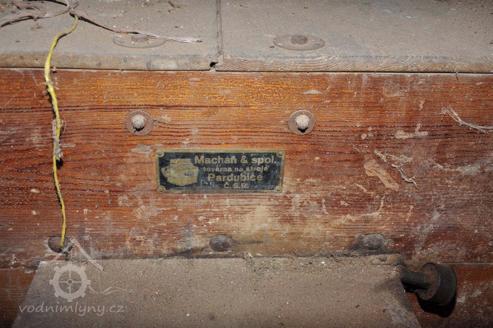 válcová stolice tuplovka výrobce Hugo Greffenius - Frankfurt nad Mohanem (vzácné), 2015, © David Veverka, (Prvky na obrázku: válcová stolice, značka výrobce na technologickém vybavení)