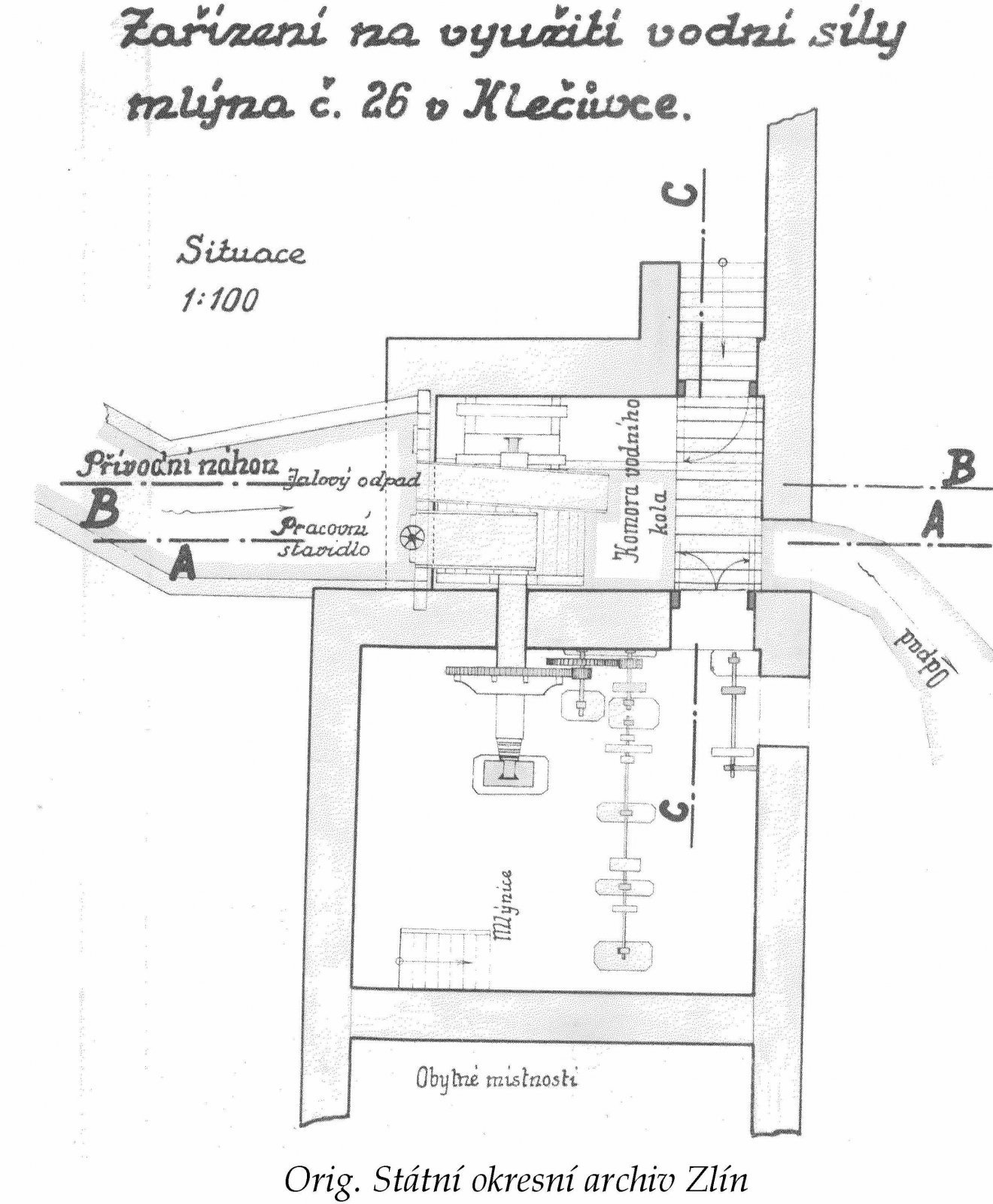 Popis1930: 1 kolo na svrchní vodu, hltnost 0,152 m3/s, spád 3,8 m, výkon 5 HP