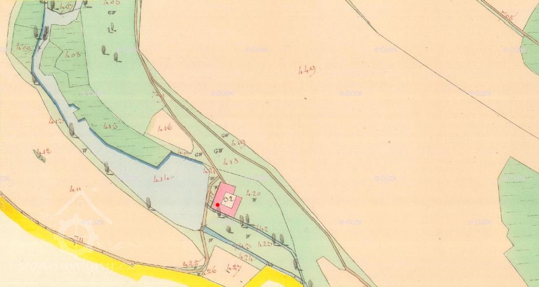 PopisV roce 1930 pohání mlýn Francisova horizontální turbína s průtokem 0.34 m3/s, spádem 3.5 m o výkonu 11.9 HP.