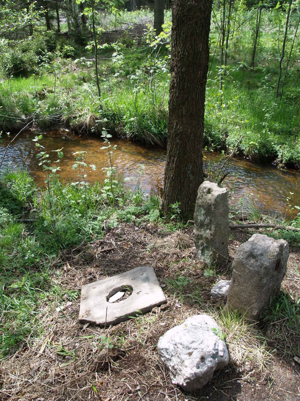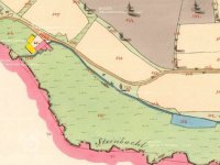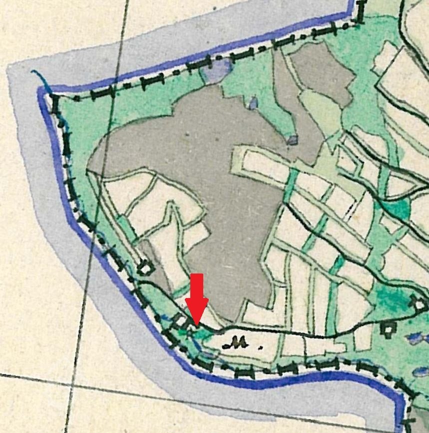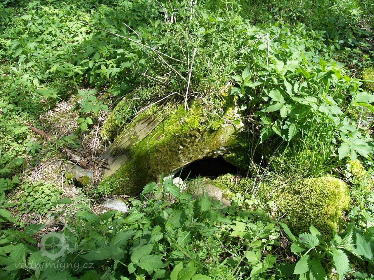 Odbočka z Újezdského potoka do rybníka. Dlouhý náhon přes louky k mlýnu.