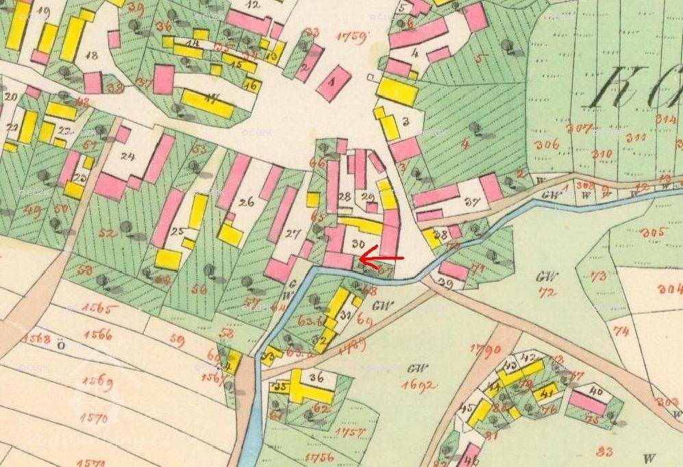 Popis1930: 1 turbína Francis, hltnost 0,18 m3/s, spád 4,15 m, výkon 7,47 HP