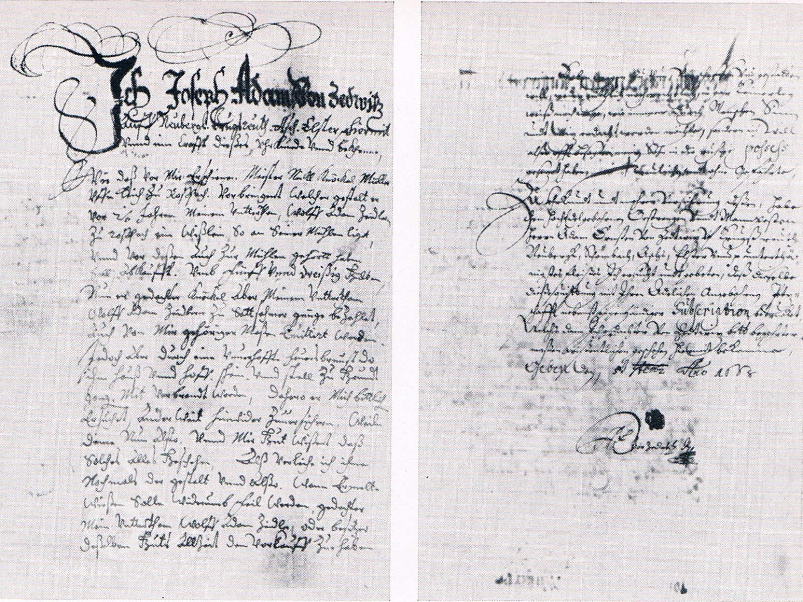 Navštívyl panovníka na zámku v Podhradí,Josef Adam von Zedtwitz, který mu dokladem 7.5.1678 povolil odebírat vodu.