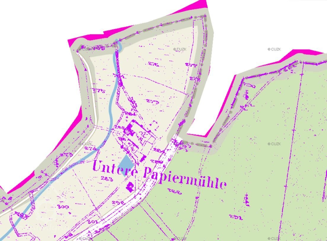 Dnes jsou vidět stopy zarostlých základů, náhonu a můstek přes Ašský potok.