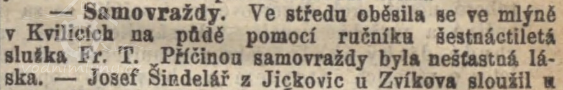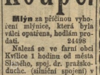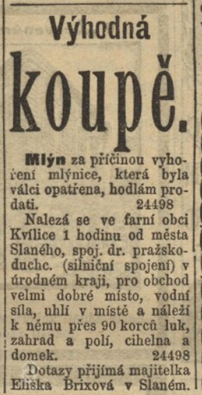 1897 mlýn po vyhoření mlýnice na prodej. Majitelka Eliška Brixová. (RR)
