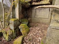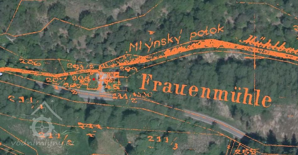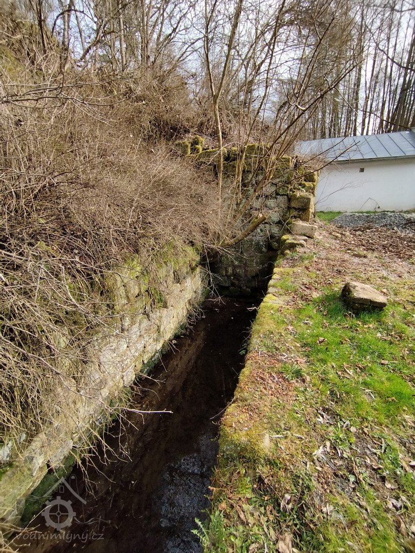 Vzadu, na konci náhonu vpravo, je místnůstka, sloužící jako akumulační nádržka, kde je vytesán kříž a dochovalo se slepé okno a výklenek, nejspíše pro svatý obrázek a sošku., 08 2011, © Vladimír Kraus, (Prvky na obrázku: náhon, akumulační nádržka)
