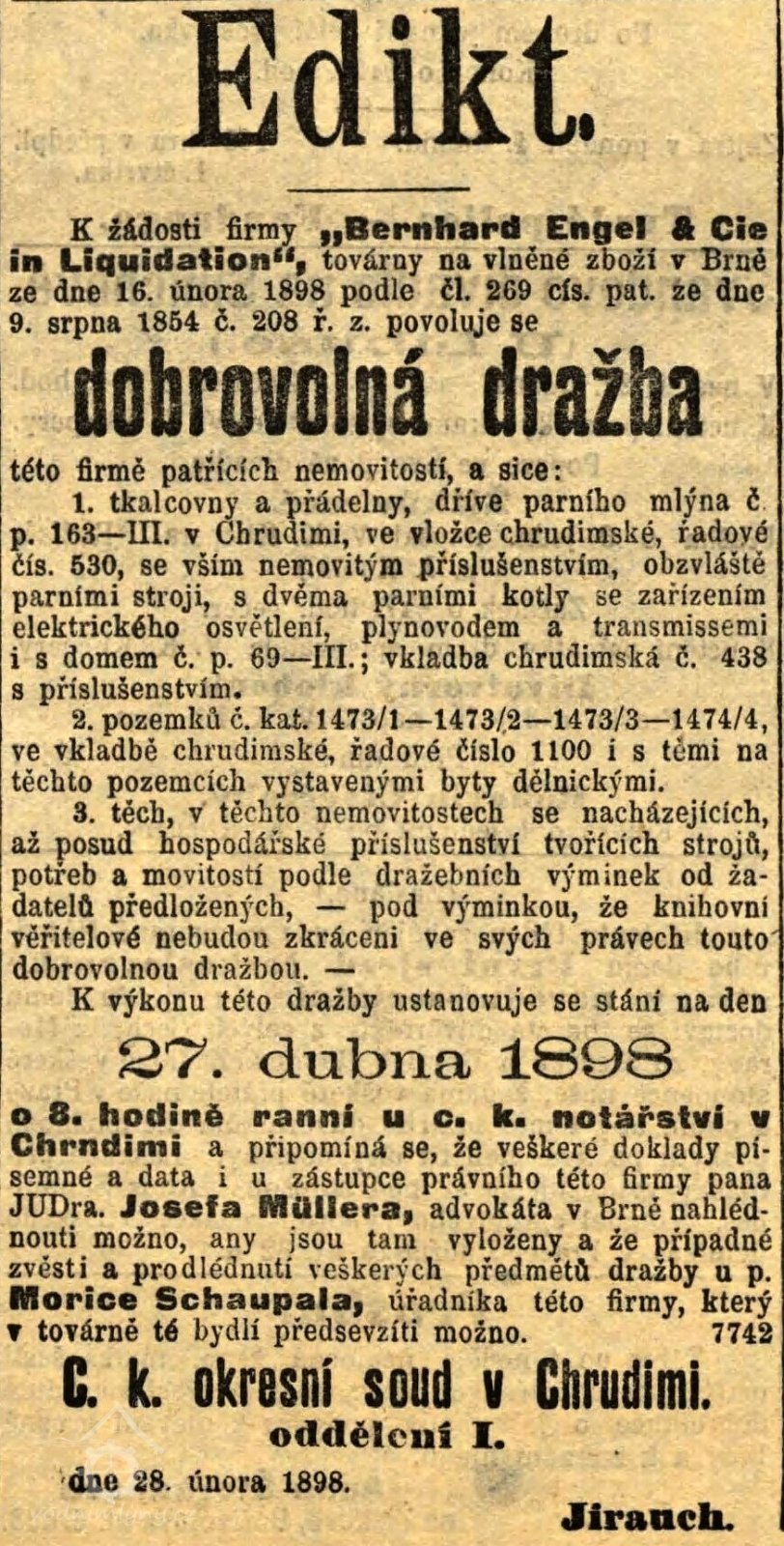 Když byl v říjnu roku 1856 vysvěcen tzv. „parník", neboli Hýrův parní mlýn na obilí, nikdo netušil, jak často bude komplex budov v dnešní ulici Obce Ležáků střídat majitele a jak málo podnikatelského štěstí s ním bude spojeno. Již v roce 1875 převedl František Hýra mlýn na svou vnučku, aby jej zachránil před konkurzem. V červnu roku 1894 jej v exekuční dražbě koupila Občanská záložna v Chrudimi a téhož dne se vlastníkem stala brněnská firma Bernhard Engel a spol. Ta provozovala v dnešním čp. 177/III tkalcovnu, ovšem v červenci 1897 byla nucena výrobu zastavit a dělníky propustit. V letech 1899 až 1917 se zde vystřídaly firmy Hernych, Stránský, znovu Hernych a Eisner. Od Josefa Eisnera ji v roce 1918 koupily Textilní závody Stein a spol., jejichž „hadrovna" přetrvala do 30. let. V dobách největší slávy pracovalo v tkalcovně a přádelně až 450 lidí. Velký počet dělníků vyžadoval ubytování, proto firma Engel a spol. vybudovala v roce 1896 v sousedství továrny „pro účely zdravého bydlení dělníků" dům čp. 215/III (dnes dům s pečovatelskou službou). (Petr Hromádko)