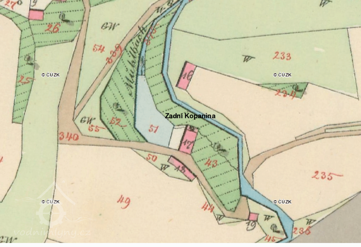 I na tomto přítoku Radotínského potoka se uživil mlýn - Čtrnáctých, který byl založen v roce 1911 v údolí Zadní Kopaniny. Čtrnáctých je známý mlynářský rod, kterému také patřil mlýn v Solopyskách. Mlýn v Zadní Kopanině byl již před II. světovou válkou přestavěn na mramorku. Budovy tam dosud stojí, obytná vila je ještě ve stavu, kdy by se dala zachránit - je útočištěm "čundráků" a v současné době se projevuje stavební ruch některé z organizací opracovávajících kámen.