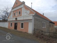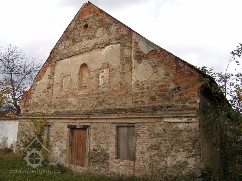 Průčelí mlýnice před rekonstrukcí, 10 2008, © Šárka Koukalová, (Prvky na obrázku: plastická omítková výzdoba fasád a štítů, zdobený zděný štít)