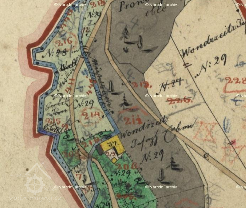 Areál vodního mlýna s obytnou roubenou patrovou budovou a hospodářským křídlem a drobnými přístavky, nazývaný U Vondřejců. Soubor budov mlýna v dnešní výstavbě z r. 1816.