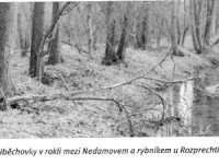 Další trasa potoka kříží silnici do Ždírce a uhýbá do široké skalní rokle, kde se napojuje ješrtě přítok z údolí mezi Březinkou a Nedamovem. V rokli lemují břehy haldy vzniklé čištěním koryta. Na konci rokle se na okraji rozprechtického rybníka napojuje další přítok z Beškovského dolu. Potok pak pokračuje mezi okrajem rubníka a vysokou skalní stěnou. Má sypané nebo zděné břehy a dno sekané do pískovcového podloží. Celková délélka trasy od výpusti z Černého rybníka až po jez činí zhruba 1,65 km. Torzo jezu s dřevěným prahem se nachází při sz okraji rozprechtického rybníka. Na březích koryta jez doprovázejí dráže v podloží se zbytky dřevěných sloupků stavidlového rámu a maltové vymazávky mezi trámy a dráží. Před jezem je koryto více vymleté do stran a nad ním se ve skalních březích skrývá další dvojice dráží a kapsa pro vodorovně položený trám (patrně pro osazení česel s manipulační lávkou). Na břehu leží torzo kovového rámu pro vytahování stavidlové okenice.