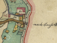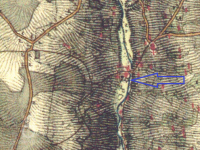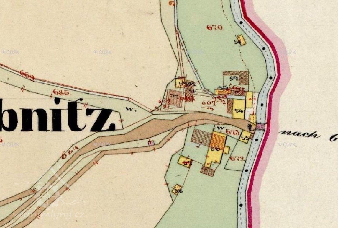 Soubor vodních staveb s nepříliš jasným vývojem, patrně pozůstatek panského dvora. Menší budova u potoka (ev.č. 117), dnes nazývaná mlýn, téměř jistě mlýnem nikdy nebyla, skutečný mlýn ležel naproti přes cestu, proti proudu. Výše ve svahu nad ním se nalézají výraznější trosky pily. Dle písemných pramenů se zde v 17.-18. stol. měl nacházet ještě hamr, jeho přesnou polohu však neznáme.