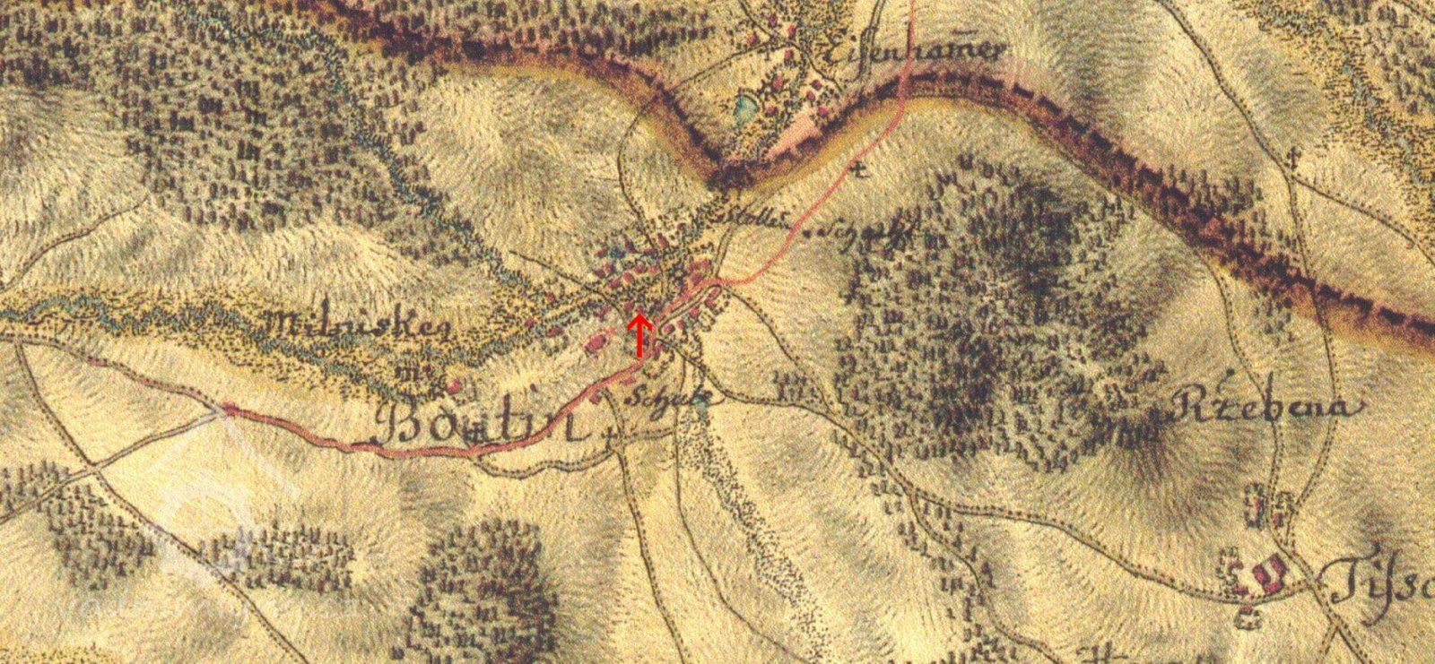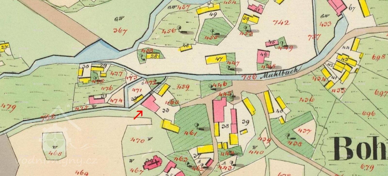 Mlýn leží asi 200 m na sever od kostela v Bohutíně