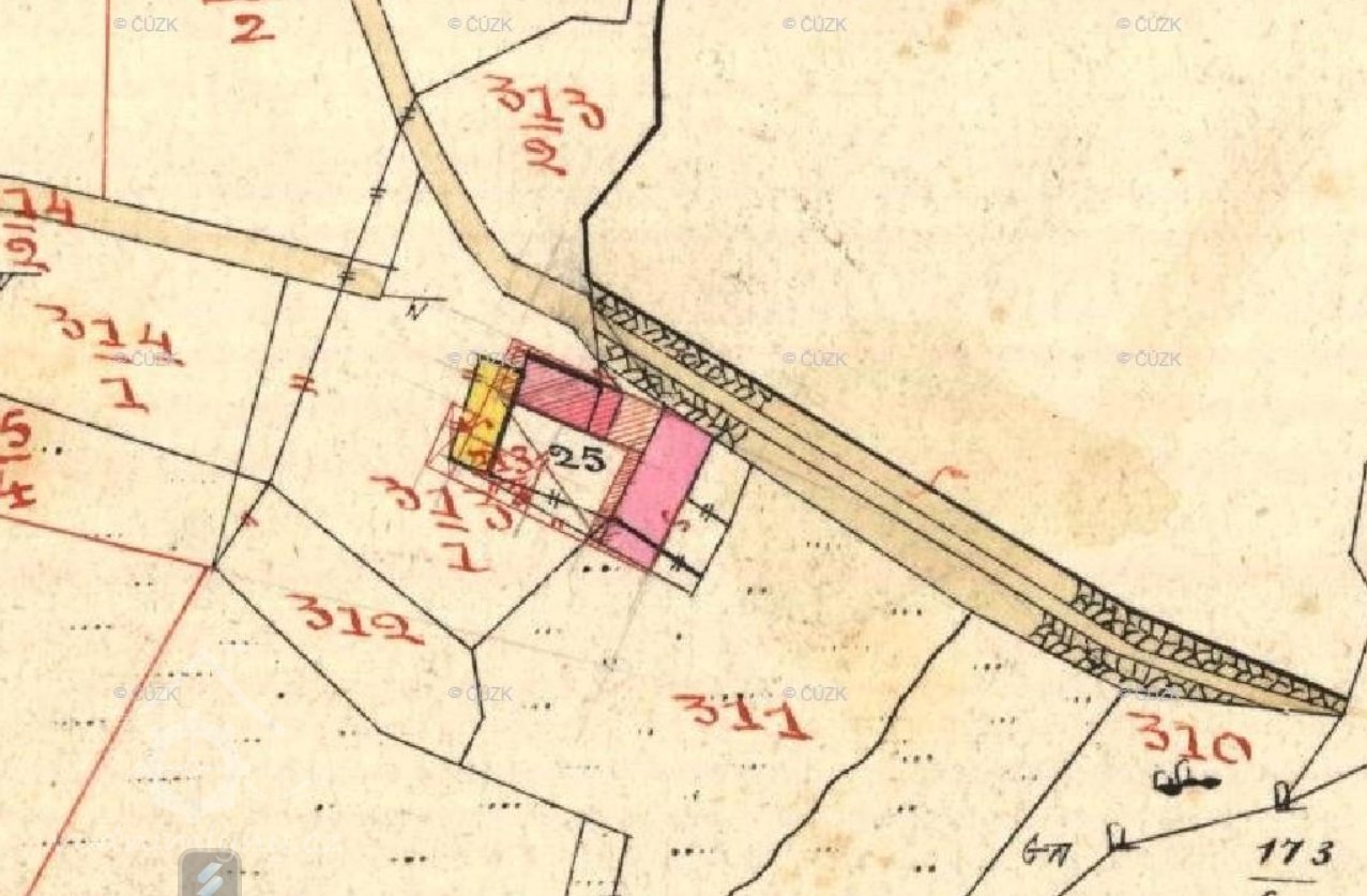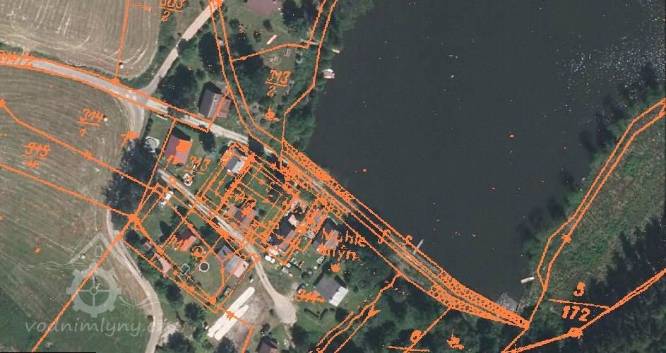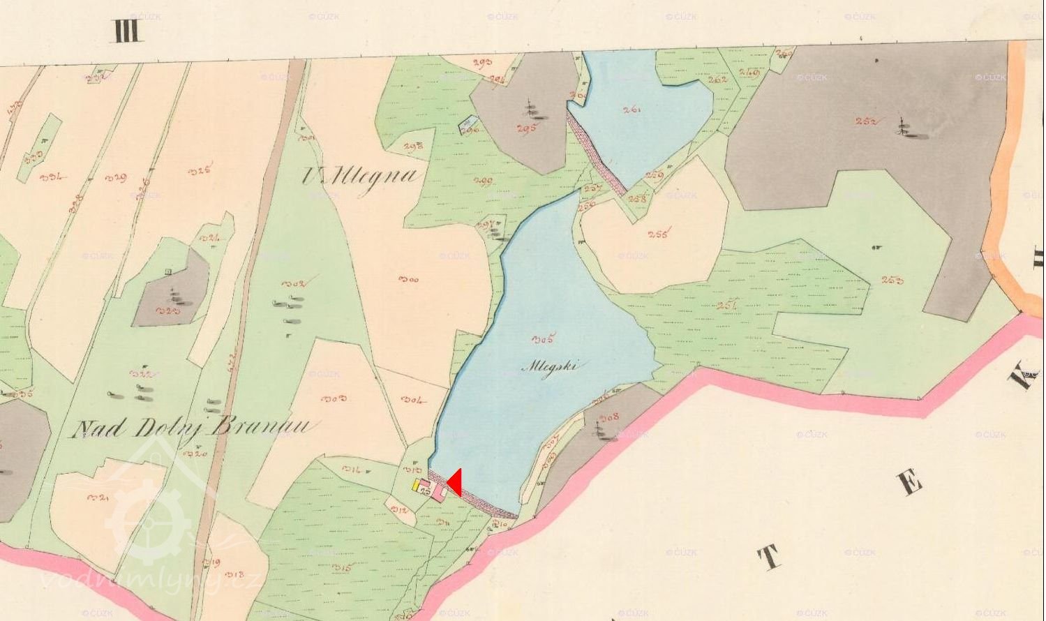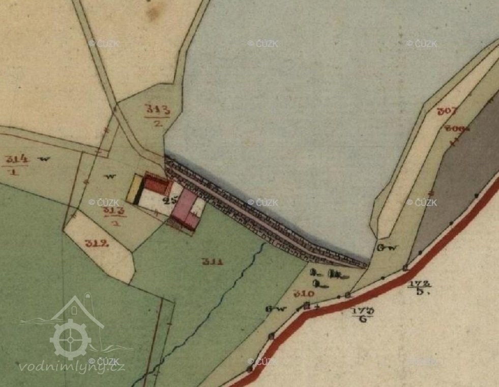 Na rybníku zv. Mlýnský č.parc.305 leží mlýn čp.21 se stoupami.