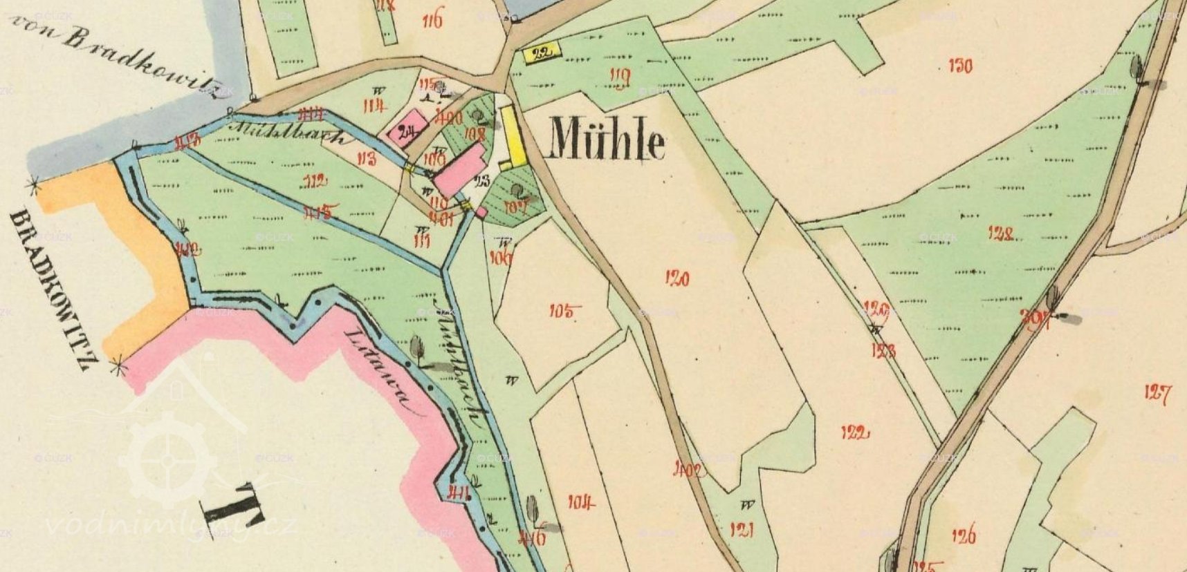 Pičínský mlýn, ode dávna zvaný, vedla rovná široká cesta k Pičínu, vlastnijí dosud 4 ha luk pod Loudilkou. Majitelé pak Damín, Eva Kropáčkovi, Tlosman J. a Skřivánek a dceru si vzal Svoboda Václav. Postavěl novou stodolu, maštale, strouhu rovnou, ode mlýna, vzorný hospodář. Syna měl učitelem. Mlýn převzal syn Gusta Svoboda, pořídil nové fran. stroje.