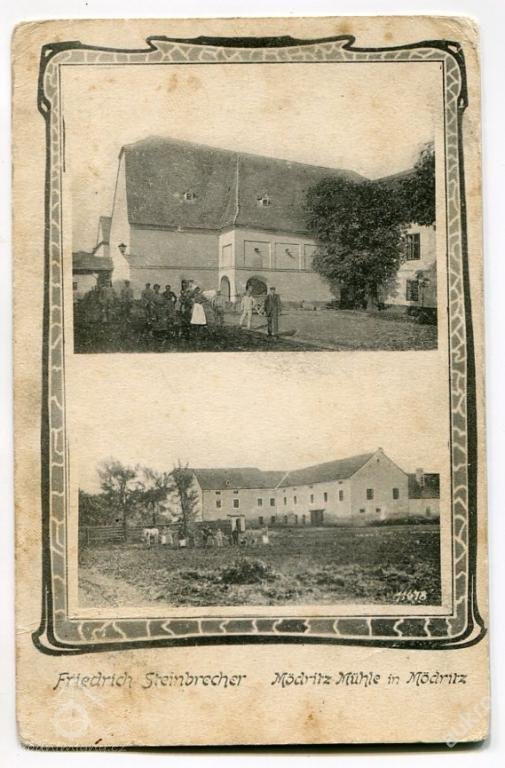 Modřický mlýn stál původně na obou stranách řeky, komunisté však levou-původní budovu mlýna, jejíž základy sahají až do 13. století, zbourali v 1958. V současné době stojí pouze budova pravá z roku 1907 a správní budovy na pravém břehu ze století 17.