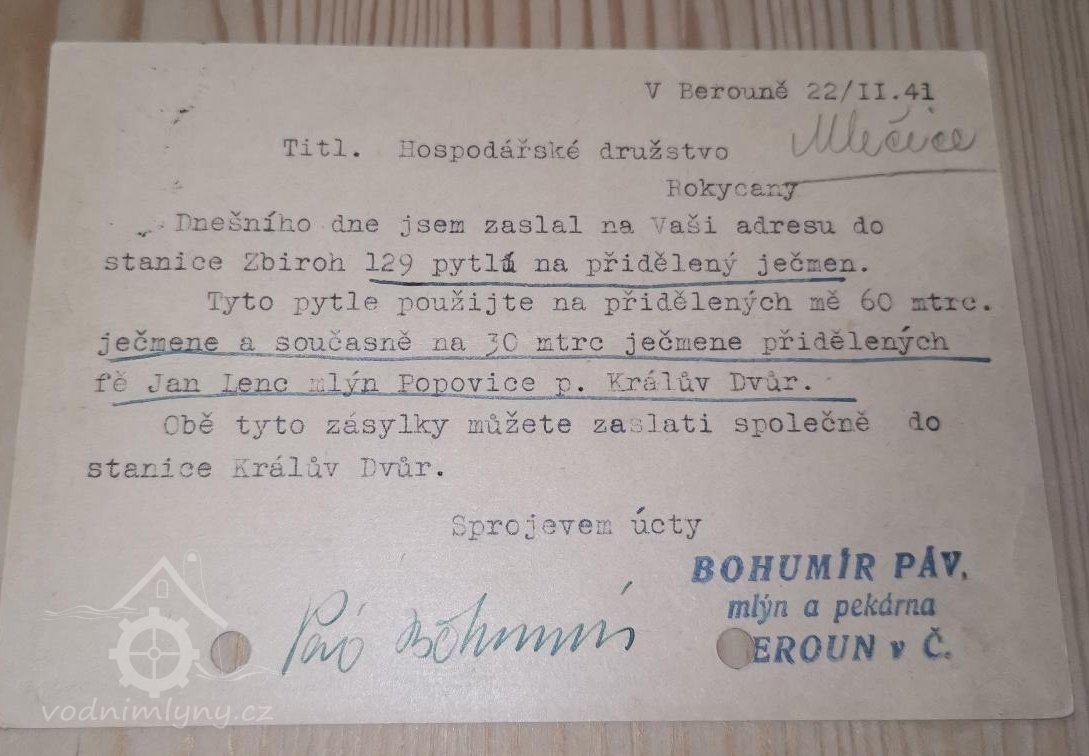 1900 v Bystřici, o. Sedlčany a 10. 6. 1929 přišel do Berouna, do výše uvedeného mlýna i s manželkou (později se jim v Berouně narodily tři děti). Předtím působil v Tíhavě u Hořovic, čp. 5, což byl myslím také mlýn. Pávův mlýn však nepatřil Bohumíru Pávovi, ale Pečecké rafinerii cukru, a. s. – Cukrovaru Beroun (dř. Seligman Elbogen), Páv byl pouhým nájemcem. (Za informace děkujeme Jiřímu Topinkovi SOkA Beroun)