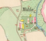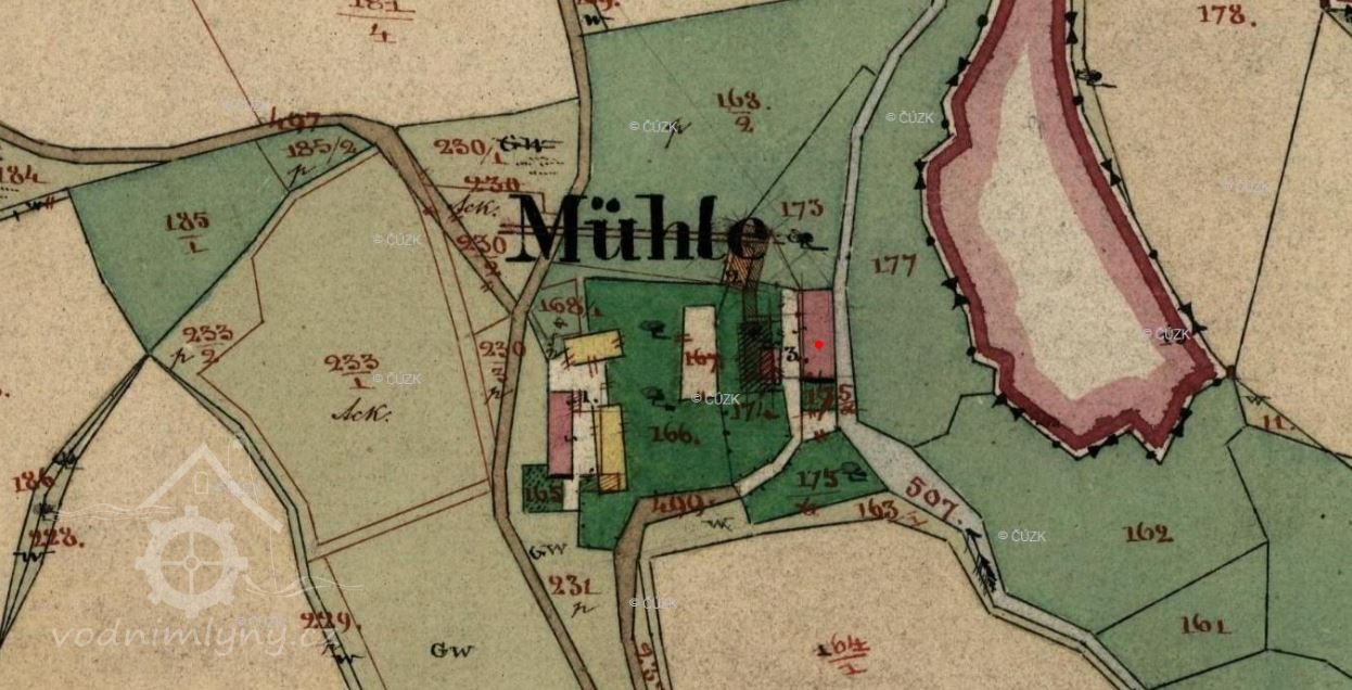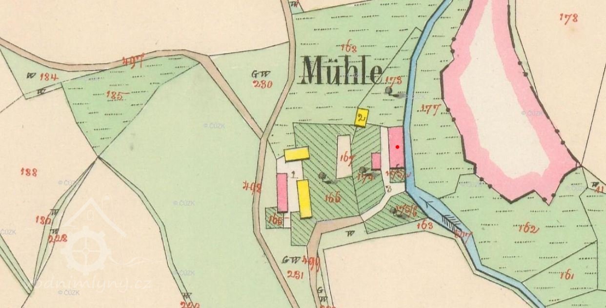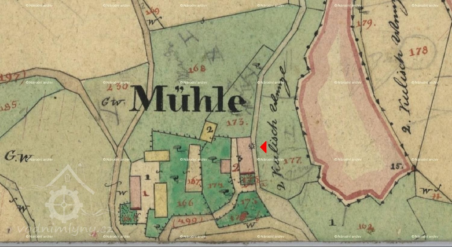1. zápis: Normální znamení zasazeno r.1880.Živnost mlynářská, tři vodní kola – první průměr/šířka 3,4/0,74 m, druhé 3,36/0,72 m, třetí 292/0,7 m.