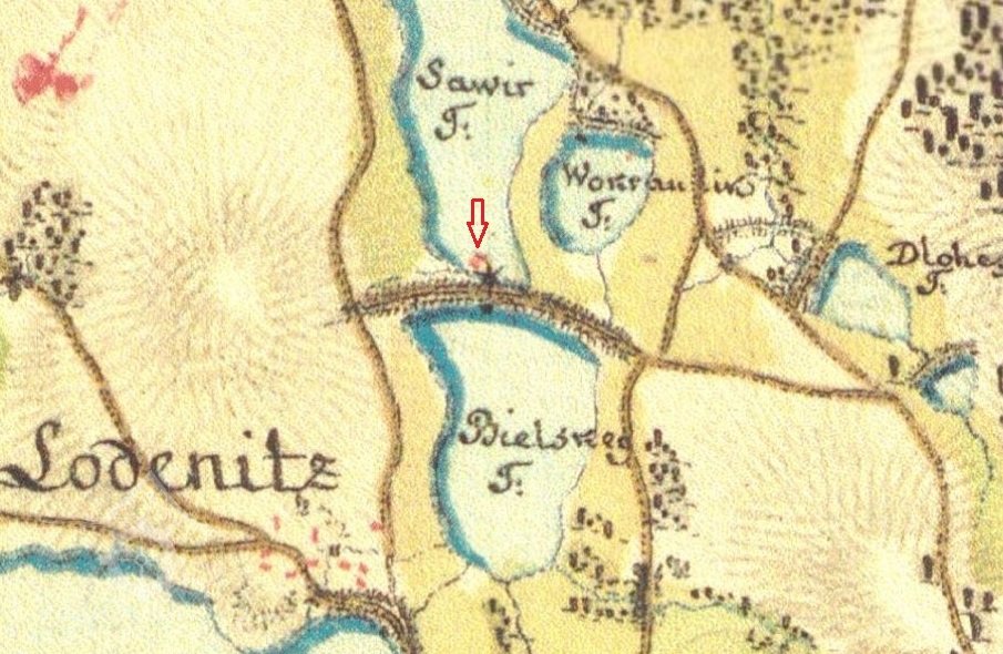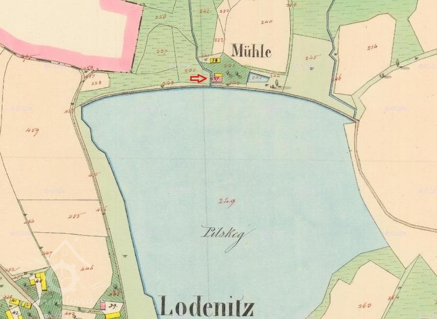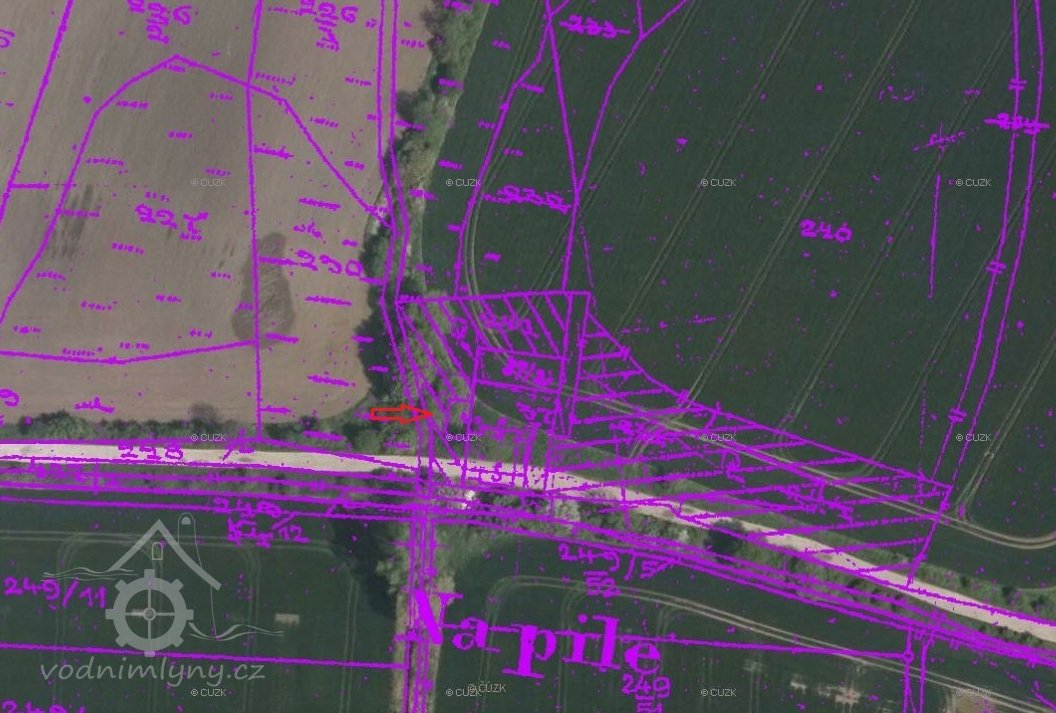 Neexistuje. Rybník nad mlýnem byl přeměněn na pole.