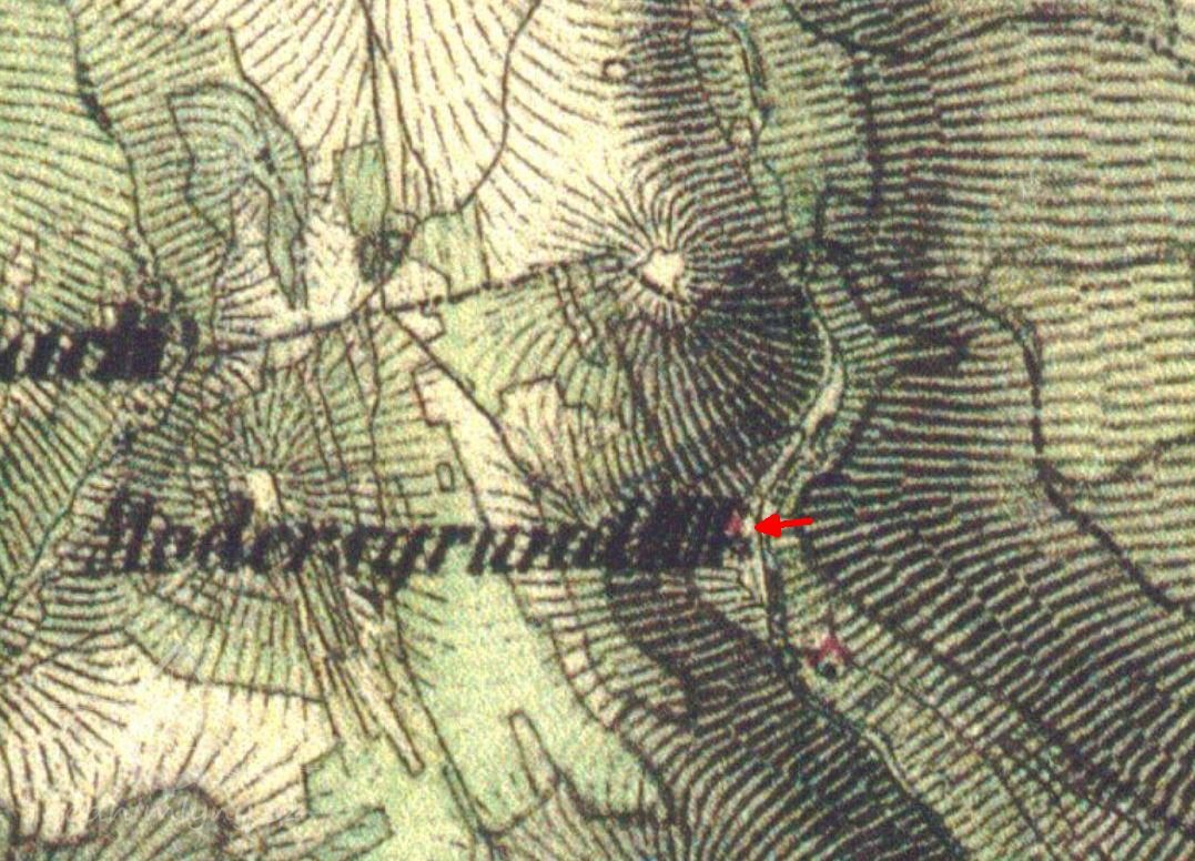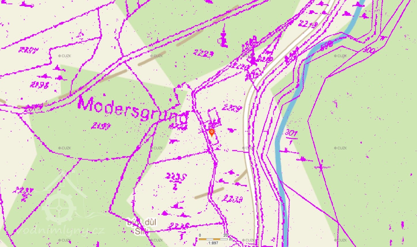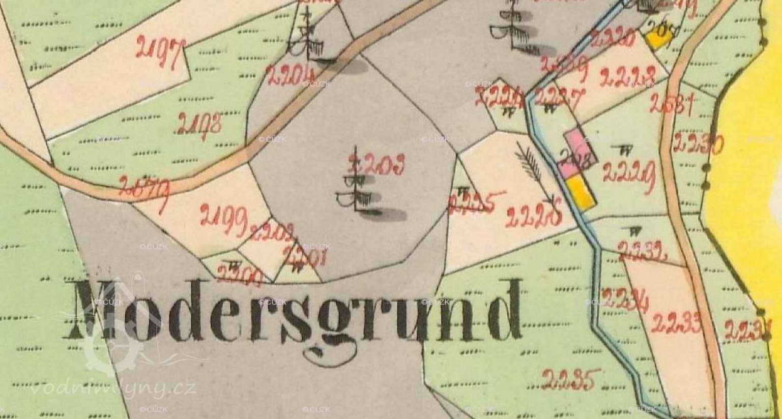 Mlýn je uveden na mapě II. vojenského mapování jako Modersgrund MM.