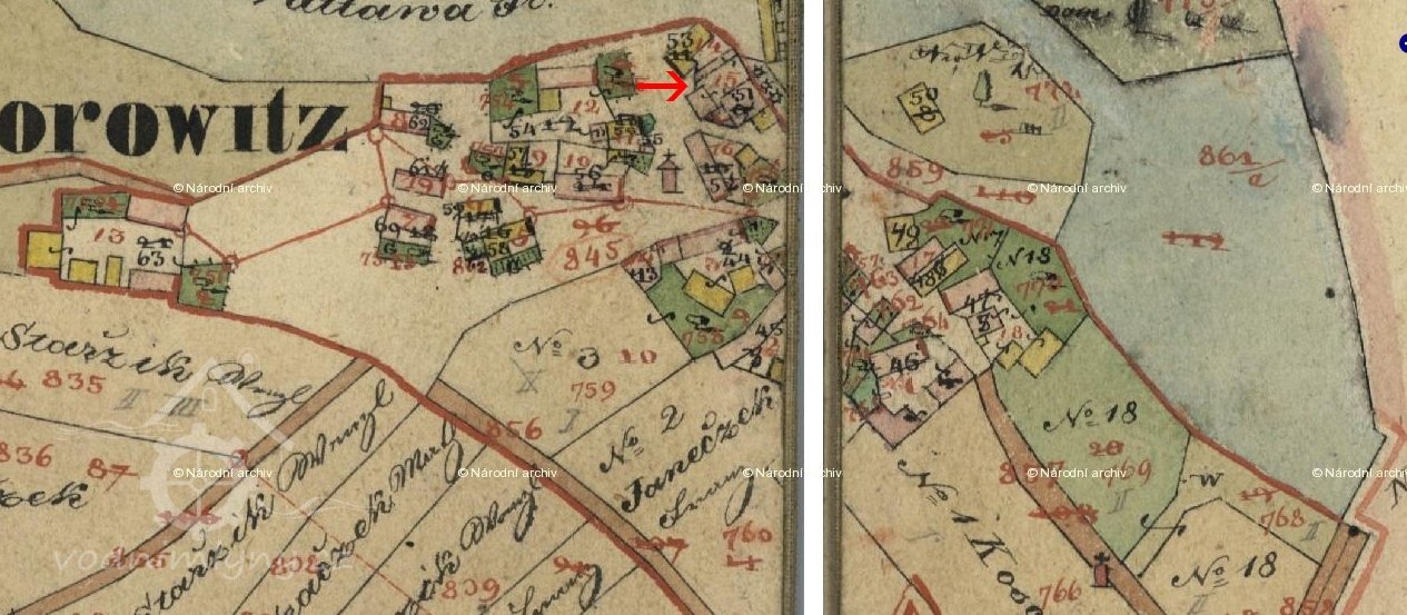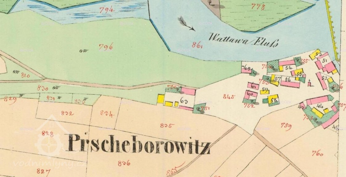 1750 Tereziánský katastr: panský mlýn o 3 kolech a 3 stoupách