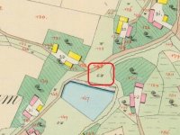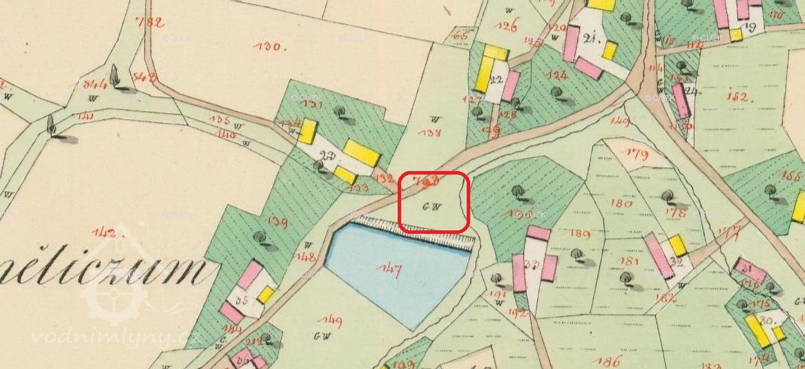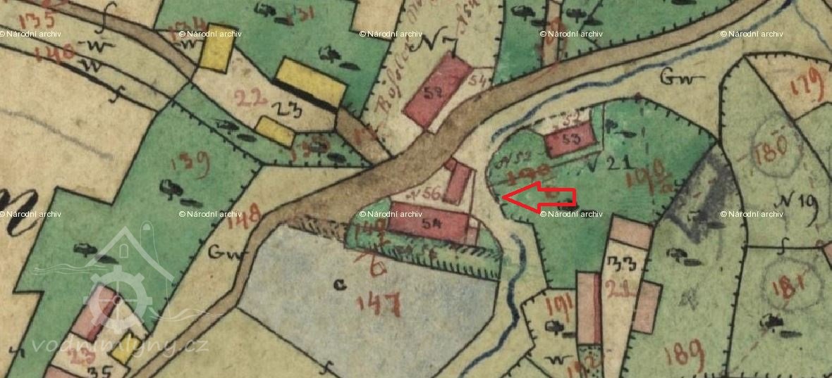 PopisVodní kniha 1874: vodní kolo na vrchní vodu, průměr 422 cm, šířka 56 cm.