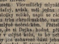 V r. 1878 byl ve mlýně rozmačkán mlýnským kolem mlynář J. Dejka z Vícemilic. (RR)