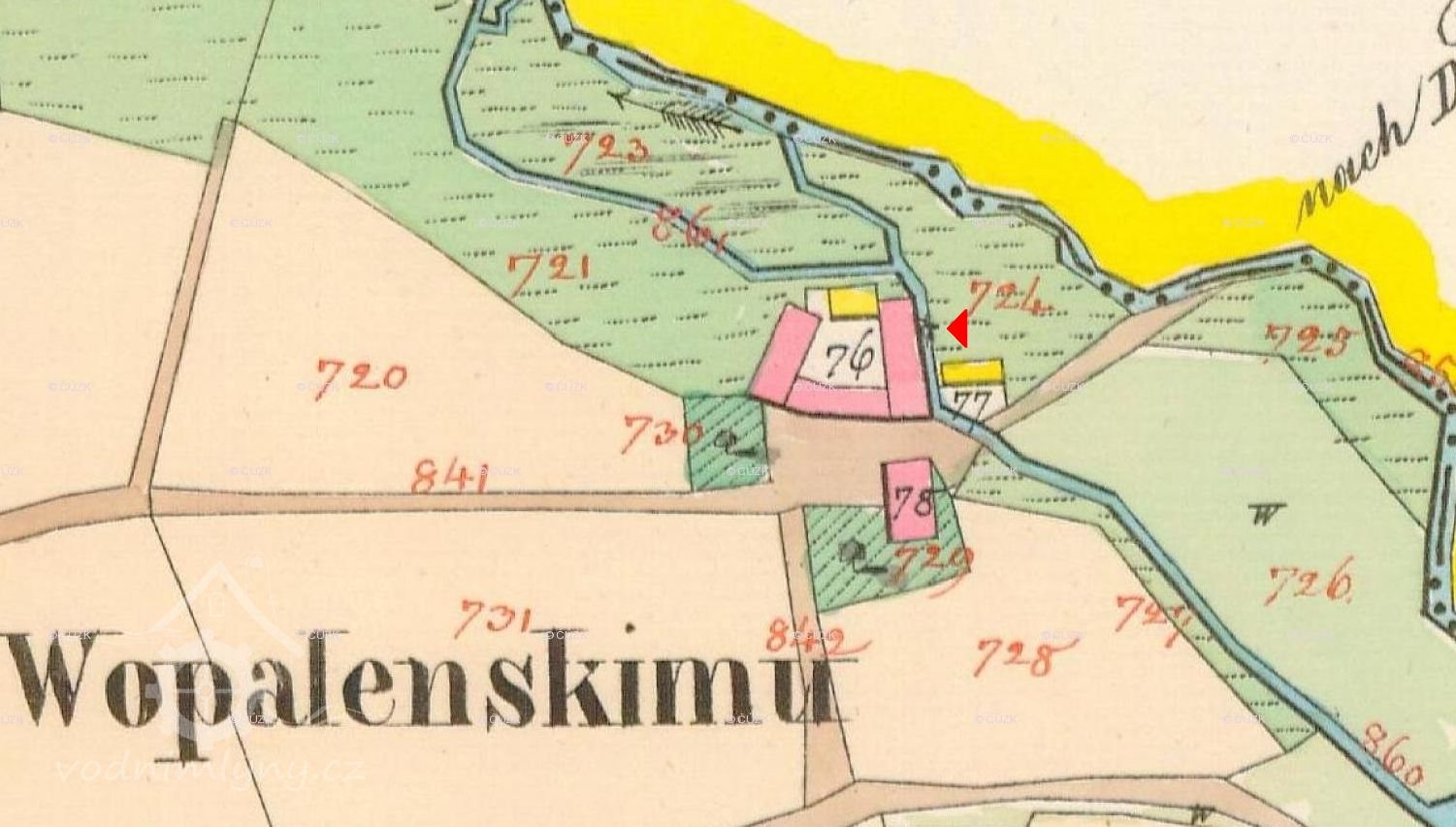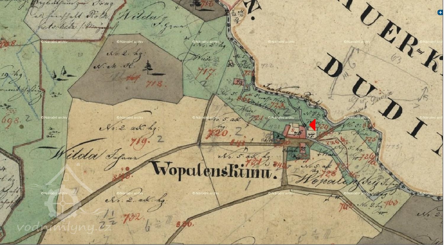 Zápisy v matrikách uvádí mlynáře Vopálenského na tomto mlýně již na začátku 18. století. Potomci zde byli až do vymření rodu po meči v r.1864. Údaje v mapách jsou často nepřesné, neboť asi 500 m proti proudu potoka je další mlýn Vlčkův. Vopálenský mlýn měl maximálně tři vodní kola, která poháněla i stoupy a pilu. Mlýn byl zrušen v r.1920, v r.1928 byla instalována Francisova turbína, ale jen k pohonu pily a hospodářských strojů.