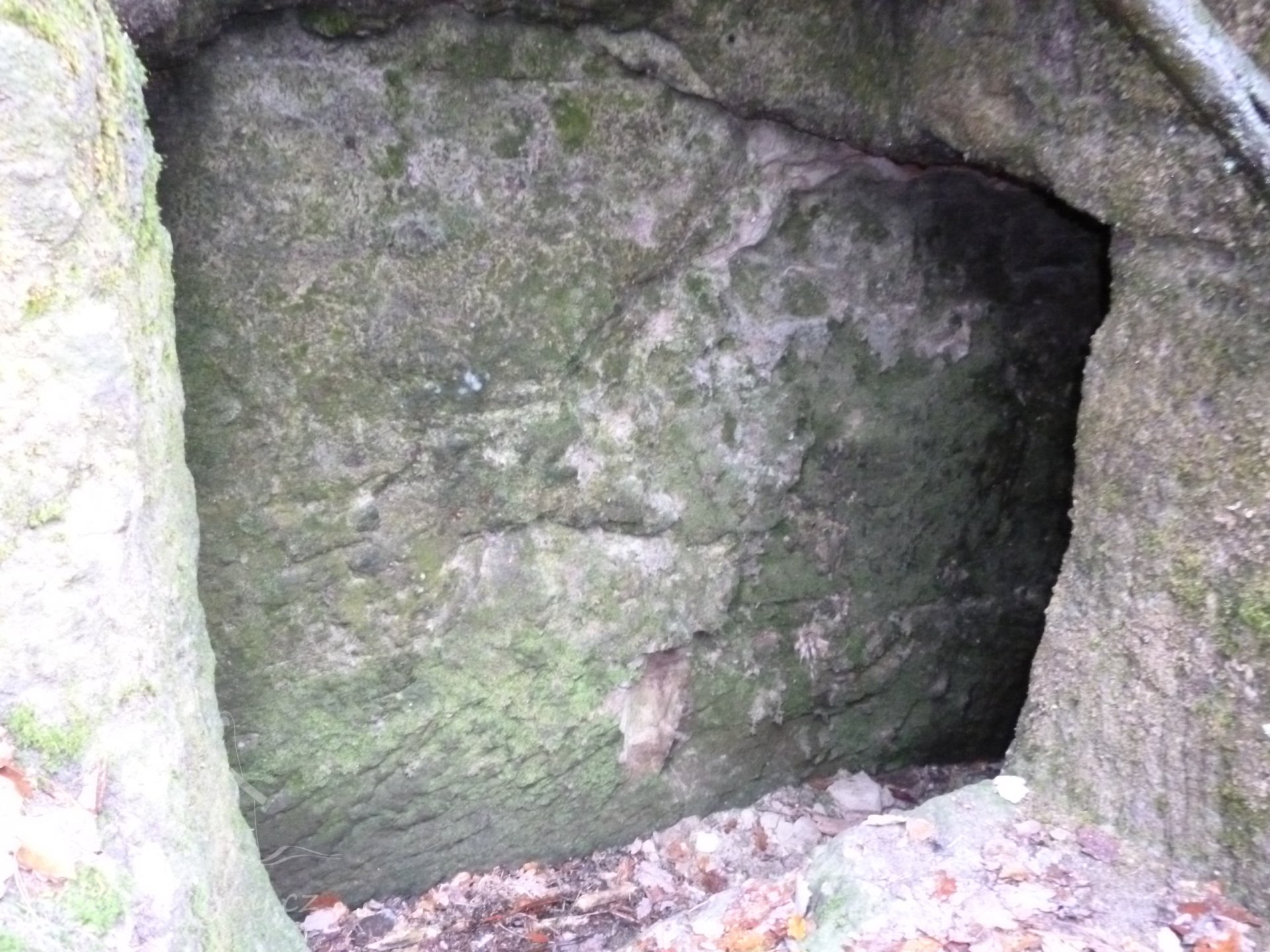 Reliéf Ukřižovaného Za touto lidovou plastikou, na které je zdejší kraj mimořádně bohatý, je ve skále vytesán náhon, který do mlýna přiváděl vodu z Hamerského potoka (resp. z dnes již zaniklého rybníčku nad silnicí Mařenice - Naděje)., 2008, © Vladimír Kraus, (Prvky na obrázku: náhon)