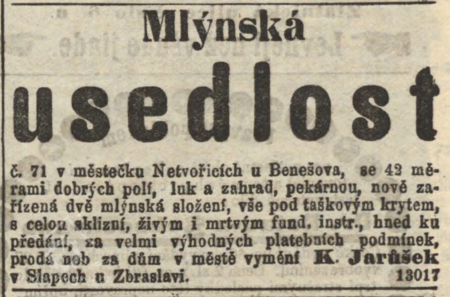 Dne 29. dubna 1928 žádal Jan Blábolil okresní správu politickou, aby rybník číslo katastrální 912 v Netvořicích u čísla 71 byl veden v knihách jako dosud. Neměl však žádných spisů ani nálezů ohledně rybníka, který byl při mlýně. Mlýn sloužil k místní potřebě mletí. O tom, že Jan Blábolil skutečně na mlýně hospodařil, je dochován opis živnostenského listu z 26. března 1936.369 V říjnu 1938 poslal okresní úřad v Benešově úřední připomínku velitelství četnické stanice v Netvořicích, aby zkontrolovalo, zda se u mlýna stále nachází vodní cejch z 9. října 1883. V listopadu 1938, po kontrole mlýna, odpovědělo Velitelství okresnímu úřadu, že vodní cejch dosud existuje s iniciály K.J. Zdali ve mlýně nedochází k mletí obilí na černo, sledovala v době druhé světové války četnická stanice v Netvořicích. Zde také kontrolovala případný podloudný obchod s potravinami.370 Jan Blábolil přihlásil svou dceru Věru roku 1942 za učednici. Mlelo se 70-90q obilí.