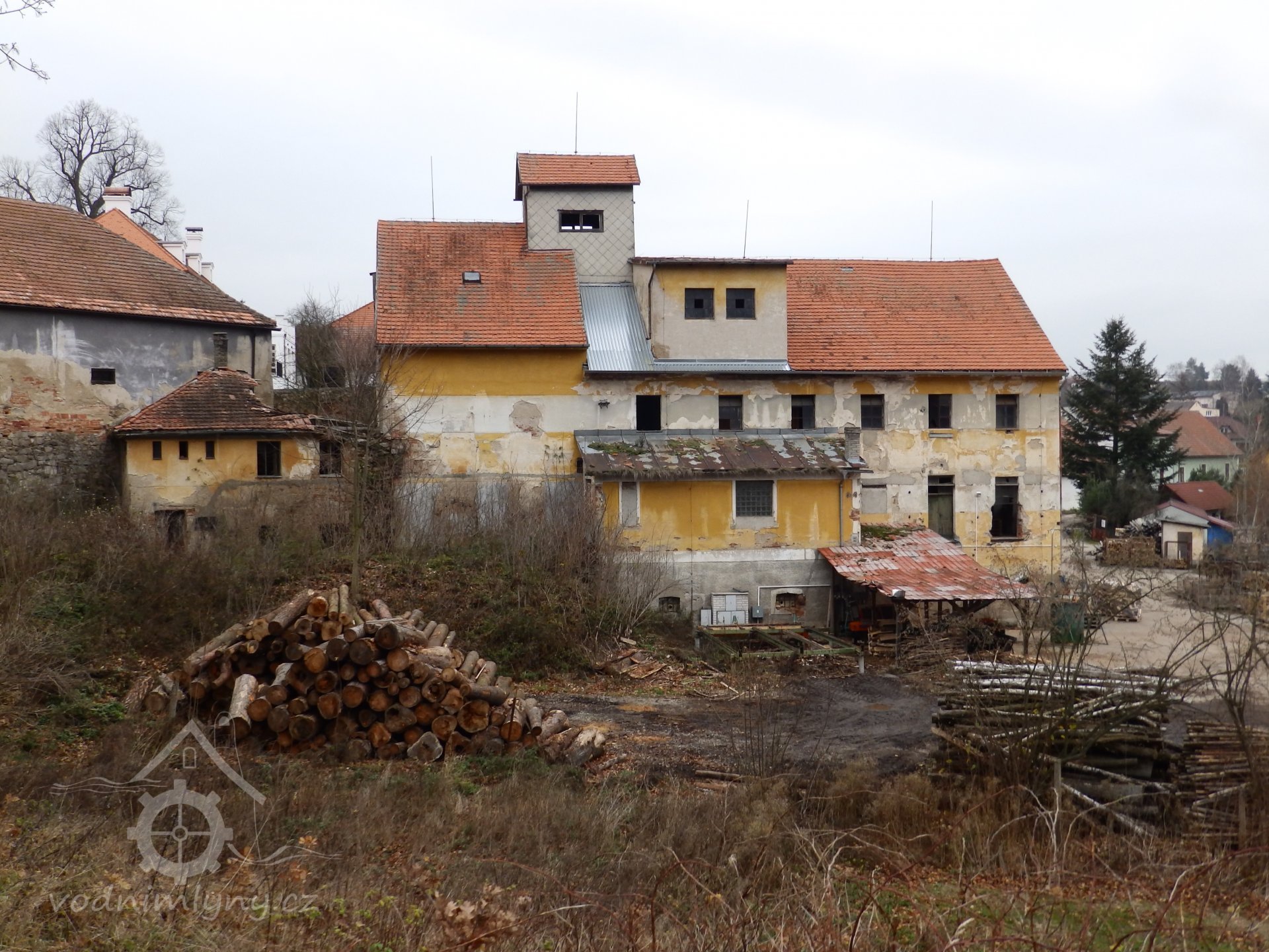 Velký mlýn industriálního typu, patrové obytné křídlo v sousedství.