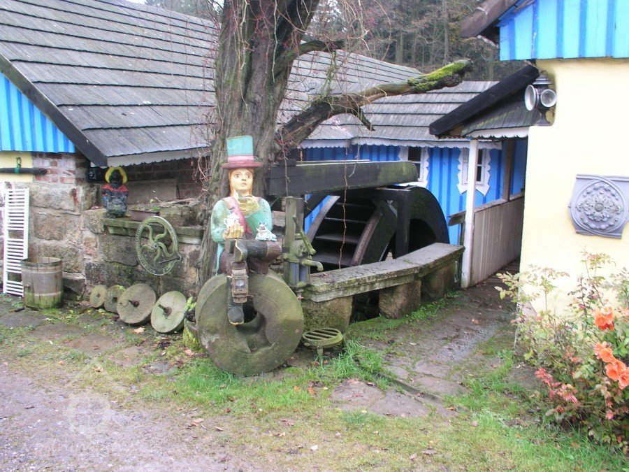 V létě roku 1945 (na národní výzvu o osídlování pohraničí po II. světové válce), zažádal příslušné úřady o přidělení opuštěného mlýna pan Václav Červený I. (můj děda ze strany otce), nar. 28. 9. 1904 v Jaroměří, zemř. 30. 6. 1977 v Komárově, vyučený jako mlynářský tovaryš - za války zaměstnán jako mládek ve mlýně Dvůr Králové n.L. - Verdek. Celý komplex: Mlýn, pekárna a pila včetně okolních pozemků, pole, louky, les, rybníky atd., byl v majetku paní Anny Patzak, která musela vše opustit a jako Němka spadala do odsunu z pohraničí v prvním sledu. Po jejím odchodu projevili o mlýn zájem bratři Sokolíkové. Byli to ale zřejmě jen "zlatokopové", kteří tu pobyli pouze několik týdnů. Údajně vše prohledali, co mělo pro ně nějakou cenu tak odvezli a aniž by vůbec zažádali o přiděleni, tak zase zmizeli. Bezprostředně po jejich odchodu přišel děda s plnou hlavou ideálů. Po pár měsících zkoušek a drobných úprav děda mlýn spustil na stávajícím zařízení. Místní sedláci jezdili s pšenicí k semletí, ale protože jejich finanční možnosti se rovnaly téměř nule a hotovosti nikdo z nich neoplýval, tak v drtivé většině bylo mleti a šrotování na dluh. Systém: Děkuju ti Václave a srovnáme to příště, nemohl zákonitě fungovat dlouho. Tento stav vedl dědu k rozhodnuti, že se mlýn odstaví a po dobu kompletní rekonstrukce bude v celoroční činnosti pouze pila. Předpokládal, že se po dobu odstávky taky trochu zlepší finanční možnosti zákazníků. Zařízení pily bylo v solidním stavu a strojový park měl dostatečně pokrýt tehdejší poptávku po řezivu a trámech na opravy opuštěných a zchátralých usedlosti v okolí, kam se čas od času nastěhovali nově příchozí osídlovatelé. Následovalo období, kdy bylo potřeba namalovat a schválit nějaké plány, vyměnit rozmístění strojů a skloubit veškeré návaznosti. Po vyhotoveni seznamů, přišlo na každodenní shánění všeho potřebného. Veškerá povoleni, dohody o dodání a montáži mlynářského zařízení, dohody o stavebních změnách a úpravách, objednávky řemeslníků na stavbu turbín, betonování vstupních šachet turbín v hrázi rybníka, oprava hráze, vyčištěni rybníka a náhonu, elektromontéry na rozvody atd. atd. Je až nepředstavitelné, že tohle všechno musel děda s tátou obstarat a všechny návštěvy u dodavatelů absolvovat vlakem nebo na kole. Na žně v létě 1947 byl mlýn plně připraven. Rekonstrukce byla provedena vskutku v téměř rekordním čase jednoho roku a několik měsíců. V přízemí byly namontovány 3 válcové stolice, šrotovník, váha a pytlovačky. V patře u vikýře nad vchodem do mlýnice byly nad jednotlivými stolicemi násypky pro obili a po levé straně (při pohledu z průčelí) vertikální válcové zásobníky. V podkroví (na straně k potoku) byla třídička, v hantýrce mlynářů - pláncichtr, což byla v podstatě soustava za sebou jdoucích kmitacích sít o různé hrubosti pláten na třídění zrnitosti mouky (od hladké až po krupici). Z tohoto nejvyššího místa mlýnice byla mouka šupnami sypána do zásobníků v patře a odtud dále do pytlovaček v přízemí. Plevy jako odpad ze šrotovníku a otruby byly sypány do sklepa, do prostor chlévů. Mezi pilou a mlýnem byly v suterénu, cca 3 m pod úrovní hladiny vody v rybníku namontovány dvě Francisovy turbiny s možností spřažení. Znamenalo to, že mohl fungovat jak katr na pile, tak i současně mlýn, každý na jednu turbínu, ale samozřejmě s omezeným výkonem. Pokud bylo potřeba rychle a hodně řezat, nebo rychle a hodně mlít, tak se turbíny spřáhly (skuplovaly) a znásobením síly se vytvořil požadovaný výkon. Pekárna plnila svůj účel jen zřídka. Pekl se pouze chleba a jen jednou v týdnu. Její zařízení si nepamatuju. Vím jen, že dole vpravo byla poměrně velká pec, kterou někdy okolo roku 1960 můj otec zboural, místnost přepažil a vytvořil obývací pokoj. Současně vybudoval pod schody do patra WC. Původní suchý záchod byl až v kůlně za garáží. Dodnes mám před očima to nádherné a řemeslně perfektně zpracované zařízení. Hladkost a slícovanost veškerých bukových prken a latěk kryjících zásobníky, světle žlutou barvu vynášecích dopravníků a celkové bandáže strojů. Lesklou černou barvu v kombinaci s temně bordovou na ocelových a litinových částech stolic, řemenic a soukolí transmise. Vycíděné skleničky odkapávacích maznic na třecích ložiskách hřídelů atd...