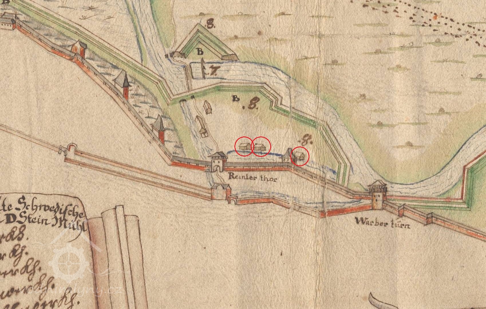Na rozdíl od 16. století se nám pro 17. století dochovalo jen málo zpráv - jedna z r. 1632 a ve druhé je k r. 1640 jmenován mlynář Jan Bartl. Před r. 1640 však byly všechny tři mlýny zcela jistě v provozu, protože se objevují na plánu okolí města asi z první třetiny 17. století. Po švédských válkách již zcela jistě obnoveny nebyly, protože jinak by byly zakresleny na plánu městských hradeb z r. 1686.