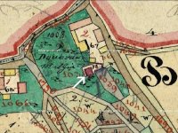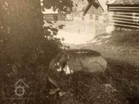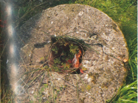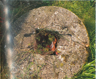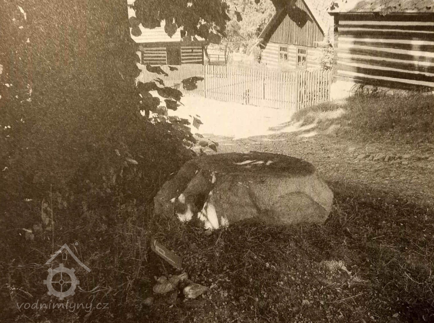 Vlevo od vjezdu na dvůr leží hrubý otesek mlecího kamene o prům. 80 cm.