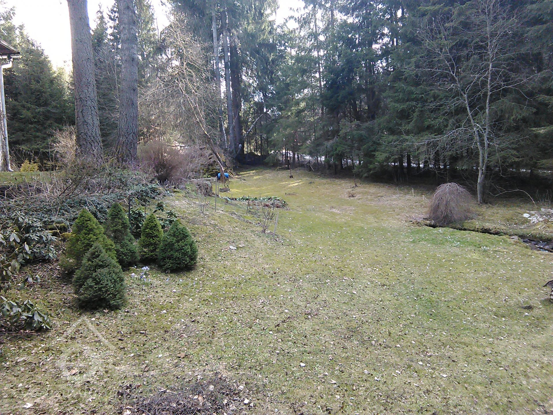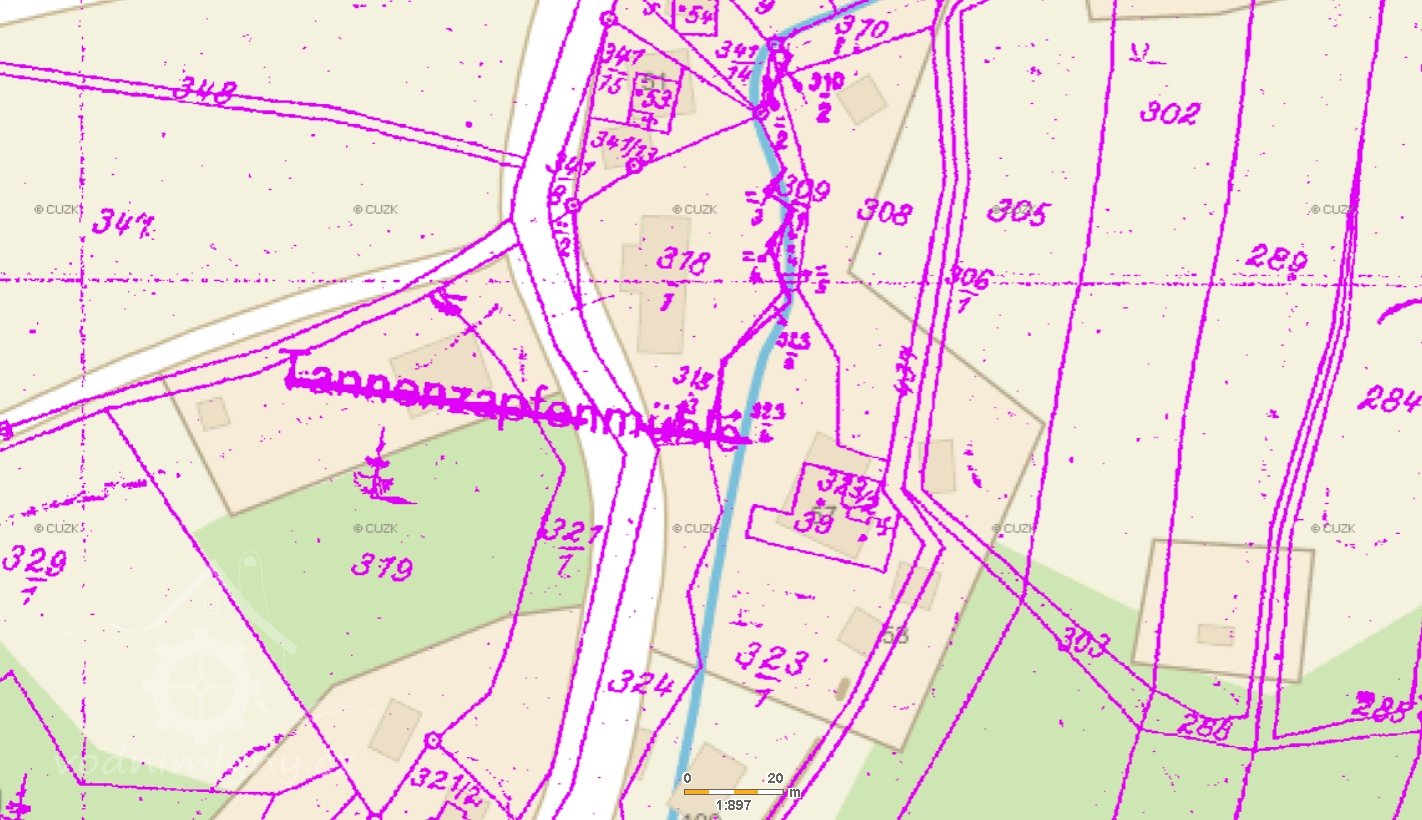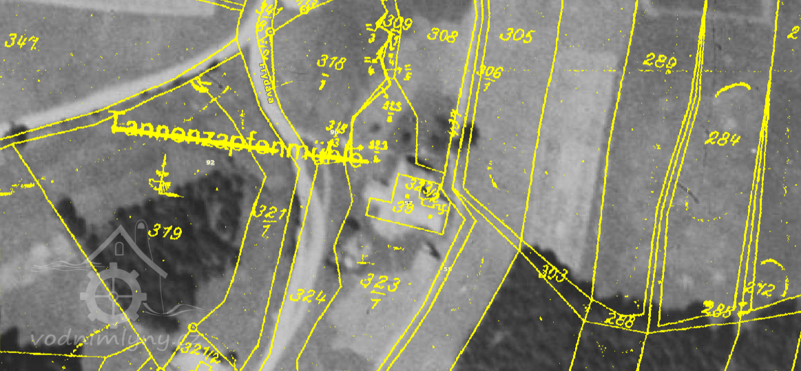 Obytné stavení mlýna Tannenzapfen (Jedlová šiška) stojí po levé straně silnice při výjezdu z Frýdavy na Pasečnou.
