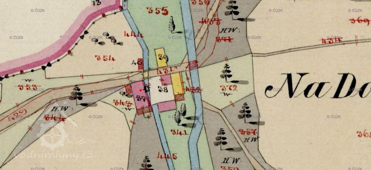 PopisDále zde bylo 1 kolo na svrchní vodu, průtok 0,202 m3/s, spád 3,8 m, výkon 6 k.