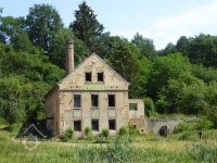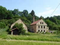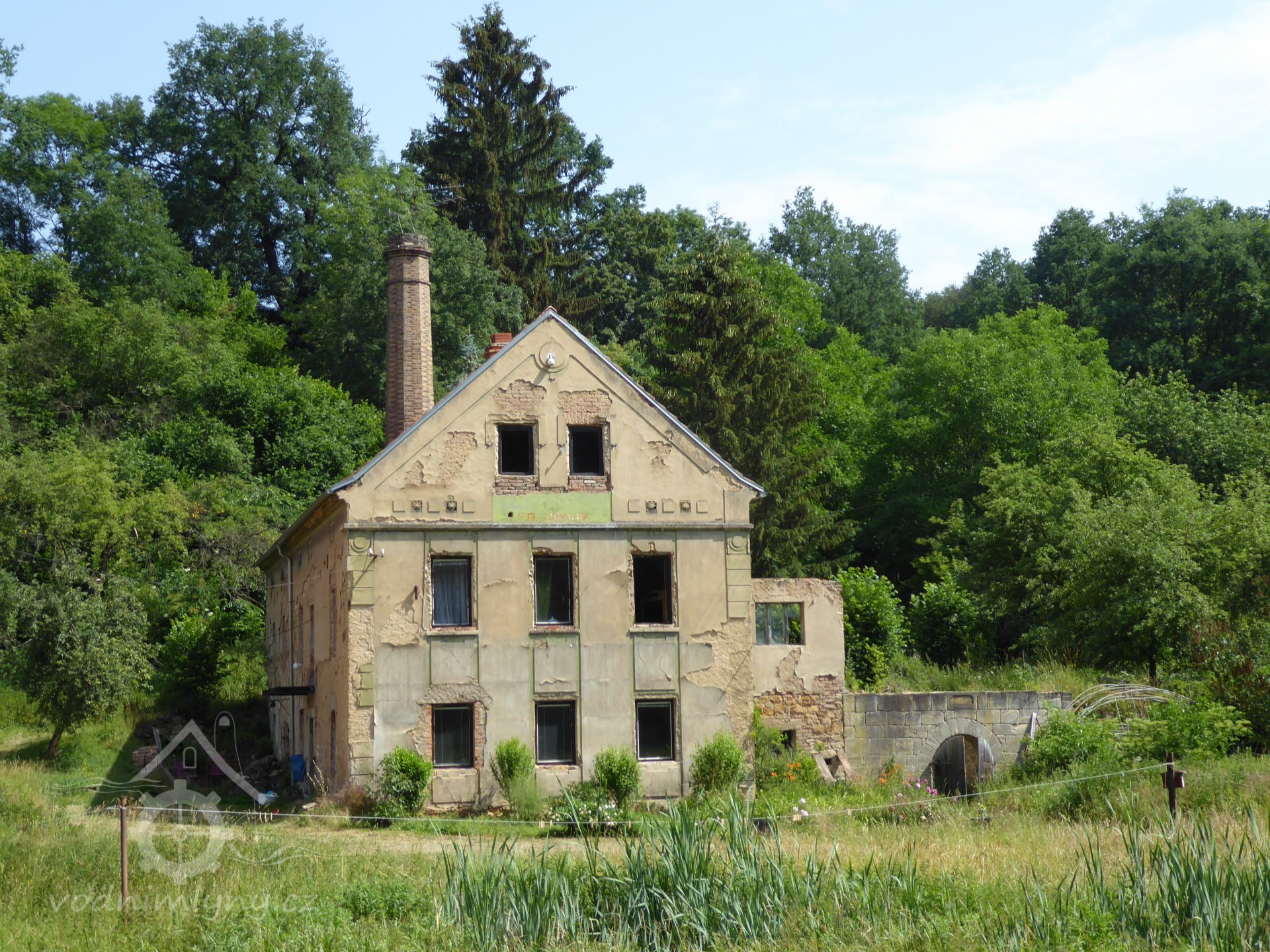Velký mlýn o dvou budovách a vysokým továrním komínem stojí na louce v údolí Milešovského potoka. Budovy mají novou střechu.