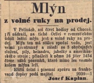 2.5.1869 Josef Kaplan, mlýn nabízen k prodeji