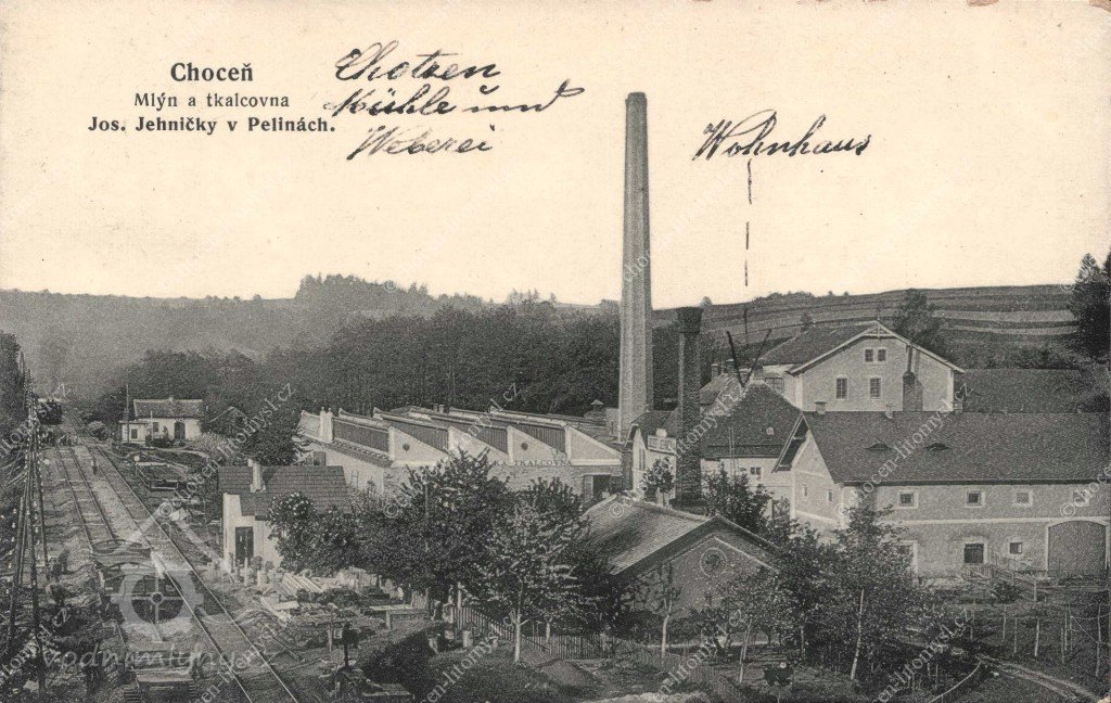 Roku 1860 náhradou za zrušený Dolní mlýn vystavěl Josef Kaplan na Tiché Orlici, pod parkem Peliny, nový vodní mlýn (dnes čp. 316), který od něj kolem roku 1878 zakoupil choceňský stavitel a později také starosta Antonín Houdek (1828–1907). Roku 1894 v něm instaloval čtyřicet tkalcovských stavů a začal vyrábět bavlněná molina, kartouny, grisety a kepry. Roku 1899 vybudoval naproti mlýnu šedový sál pro dalších 150 stavů, s připojenou kotelnou a strojovnou. Vyprojektoval jej specializovaný královéhradecký stavitel František Plesnivý, který také roku 1906 navrhl jeho rozšíření na nepravidelném východním zbytku pozemku. Mezitím roku 1903 však tkalcovnu zakoupil jaroměřský obchodník Josef Jehnička († 1937). Zaměstnával zde 250 lidí, na 520 stavech vyráběli bavlněné zefíry a sypkoviny, specialitou byly obuvnické podšívkoviny. Roku 1908 začal budovat dělnické domy na Pelinách (čp. 522, 523 a 524 a 559–561). Korábku, tkalcovnu čp. 6 v Zářecké Lhotě 49°59'59.91"N, 16°14'44.48"E, založil roku 1897 Emanuel Koráb a roku 1910 zde instaloval turbínu, v roce 1913 však tkalcovna vyhořela. Josef Jehnička ji zakoupil a obnovil. V hlavním závodě v Pelinách roku 1916 zednický mistr Alois Vrátil provedl třílodní halu šlichtovny a sukárny na druhé straně náhonu, spojenou s tkalcovnou krytým můstkem. Výroba však byla záhy poté následkem války omezena. Roku 1916 zde také Jehnička spustil první elektrárnu o výkonu 150 kW. Karlínská Křižíkova továrna vybudovala rozvodnou síť, pomocí níž Jehničkova nová elektrárenská společnost zajišťovala od roku 1918 dodávku elektrického proudu pro Choceň i osadu Březnici. (Od roku 1922 se na ní podílel i generátor 120 kW, instalovaný v Korábce, obnovená vodní elektrárna zde pracuje dodnes.) Roku 1923 však byla výroba zastavena a teprve synové zakladatele, Josef Jehnička ml. (1899–1941) a Alois ji roku 1927 obnovili a přestavěli podnik na tkalcovnu hedvábí. Ještě roku 1946 navrhl choceňský architekt Čeněk Mužík pro Aloise Jehničku vestavbu vrátnice s verandou a bytu vrátného do západní části šedového sálu. Po znárodnění roku 1948 se továrna stala součástí n. p. Henap a později Hedva, závod 14, se sídlem v Moravské Třebové. Soustředila se na výrobu hedvábných šatovek a prádlovek na strojích přivezených z Letohradu, po rekonstrukci roku 1965 pak na výrobu širokých pánských podšívek. Dnes zde působí strojírenská výrobní a obchodní společnost.