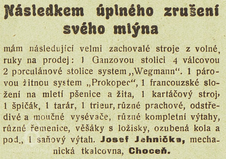 V r. 1911 rozprodej zařízení mlýna.