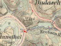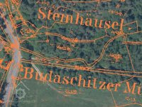 Čechy-0306-1- Bohdašice, mapový list číslo 3.Původně se jednalo o dům čp.16/st.p.33/1 a objekt na st.p.33/2.Voda k mlýnu byla vedena náhonem v délce cca 380 metrů.Tento náhon ,na mapě Stabilního katastru označený jako Mühlbach,začínal v řece Otavě asi 100 m pod stávajícím mostem do Annína .
