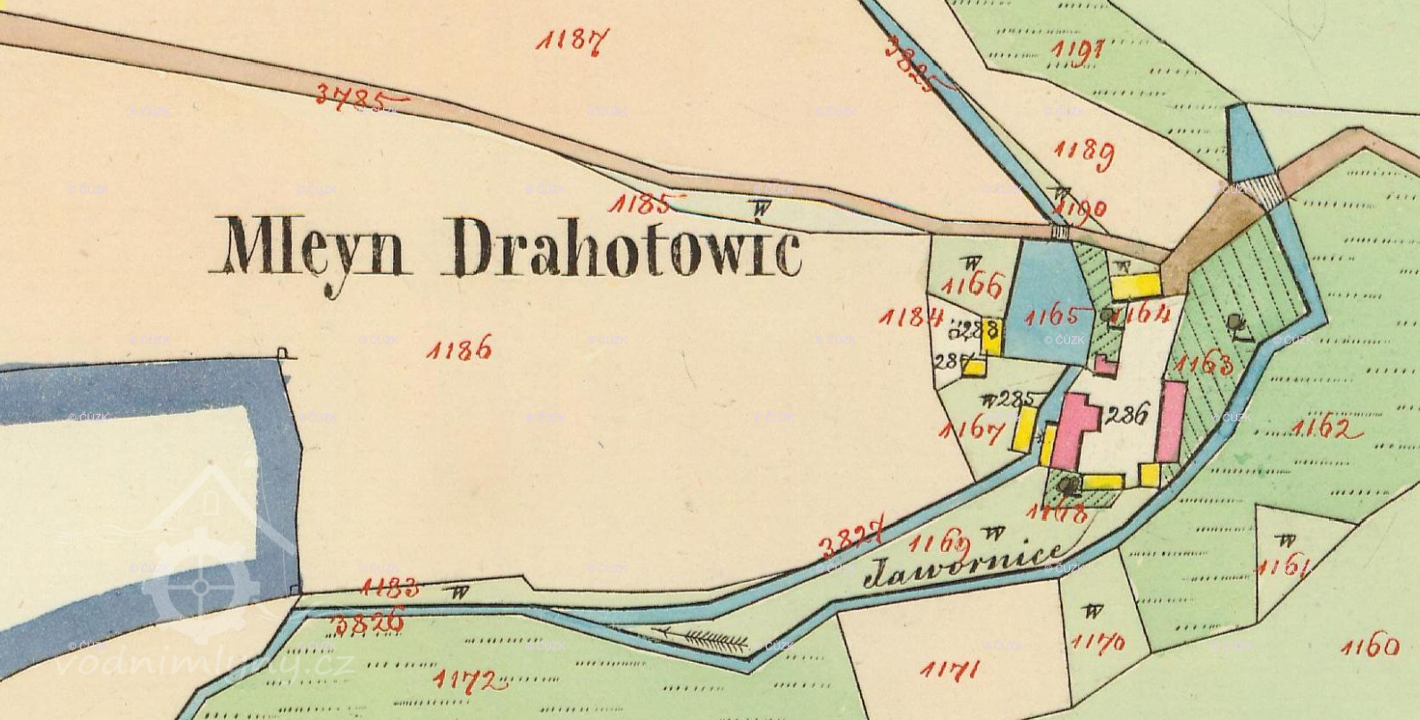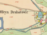 1810 mlýn o trojím složení s pilou, cihelnou, pecí a 16 jiter polí a 6 jiter lluk, komisionálně odhadnuto na 19.820 zl.