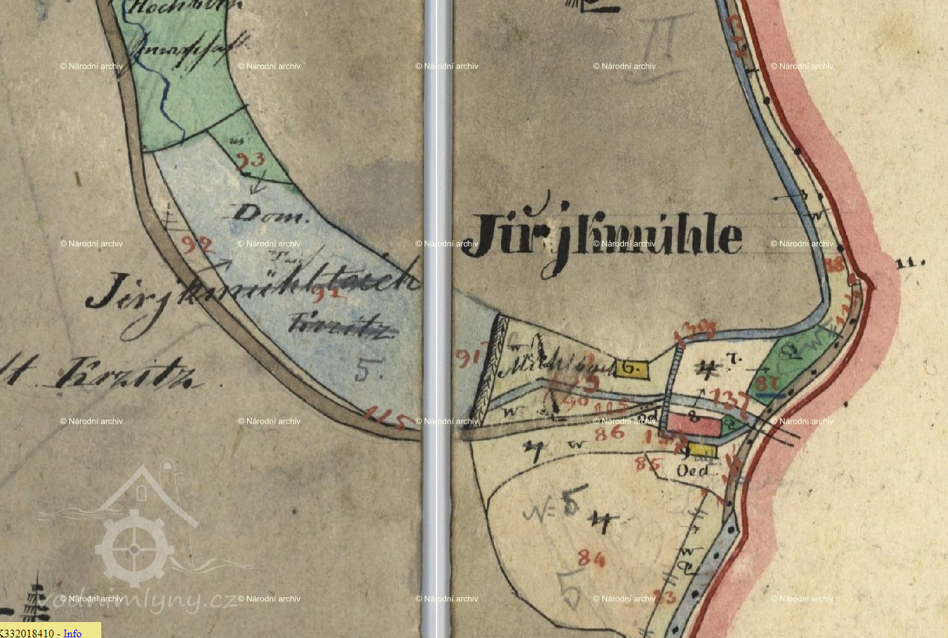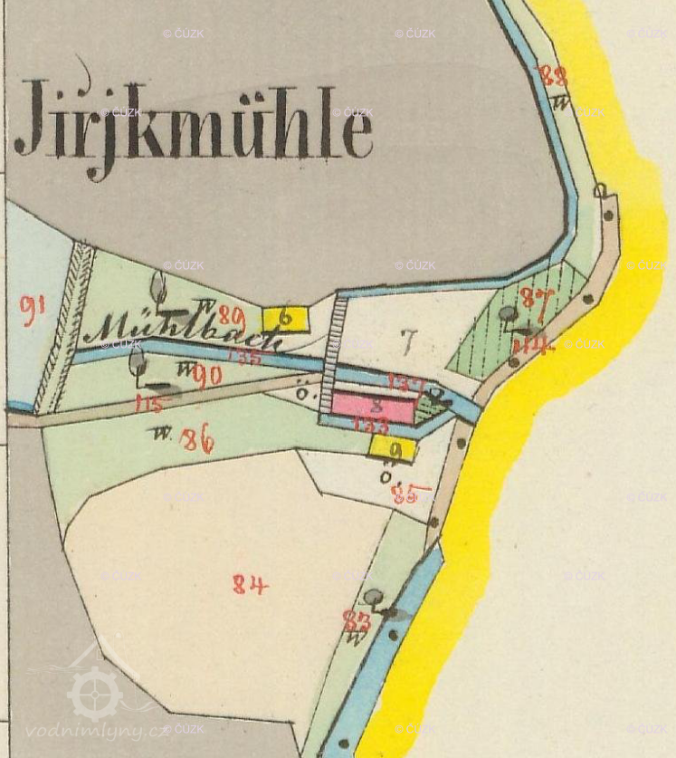 1824 Fr. Šrajer ze sousedního Obecního mlýna žádá obec Čistou o pozemek na stavbu pily, ten postoupen s podmínkou, že se o jejím postavení dohodne se sousedem Antonínem Kočkou z Jiříkova mlýna, ten si za to vymínil povolení, že může vést vodu z Javornice náhonem na jedno kolo svého mlýna.