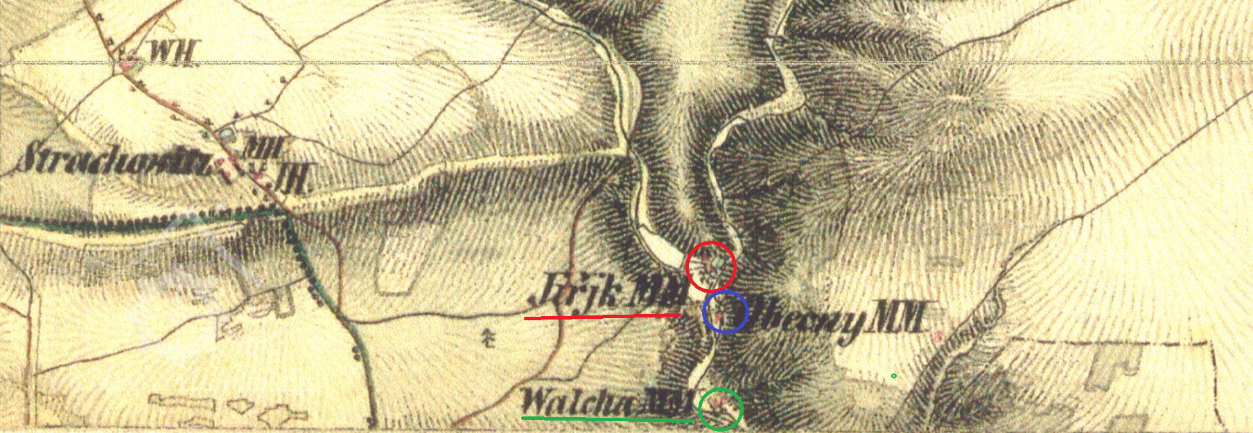 1785 ve Strachovicích 4 stavení: panský dvůr, hostinec, Horní-Albertův a Dolní-Jiříkův mlýn