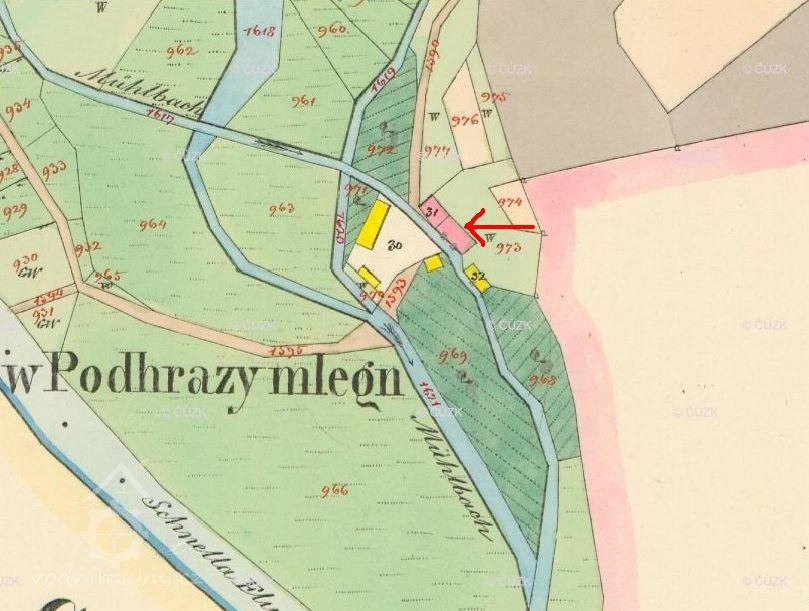 1549 mlynář Marek, plaský klášter mu prodal polnosti pod rybníkem za 45 kop a chalupu pod hrází, aby si je opravil, z všeho bude ročně platit půldruhé kopy. V řece pod mlýnem má mlynář právo lovit ryby, ale jen pro svou potřebu, zároveň ale musí řeku hlídat před pytláky. Pokud bude chtít lovit ryby i v rybníku, budou řeholníci moci v jeho chalupě svobodně pobývat.