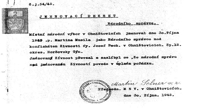 30.10.1945 je Martin Musil jmenován Národním správcem nad konfiskátem živnosti fy. Josef Beck,mlýn Ohnišťovice 12. Odsun německých obytel z obce je pozdržen a tak do poloviny roku 1946 ( kdy se uskutečnil ) bydlí pohromadě rodina původního i nového mlynáře ve mlýně ve shodě a společné práci.