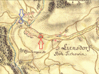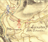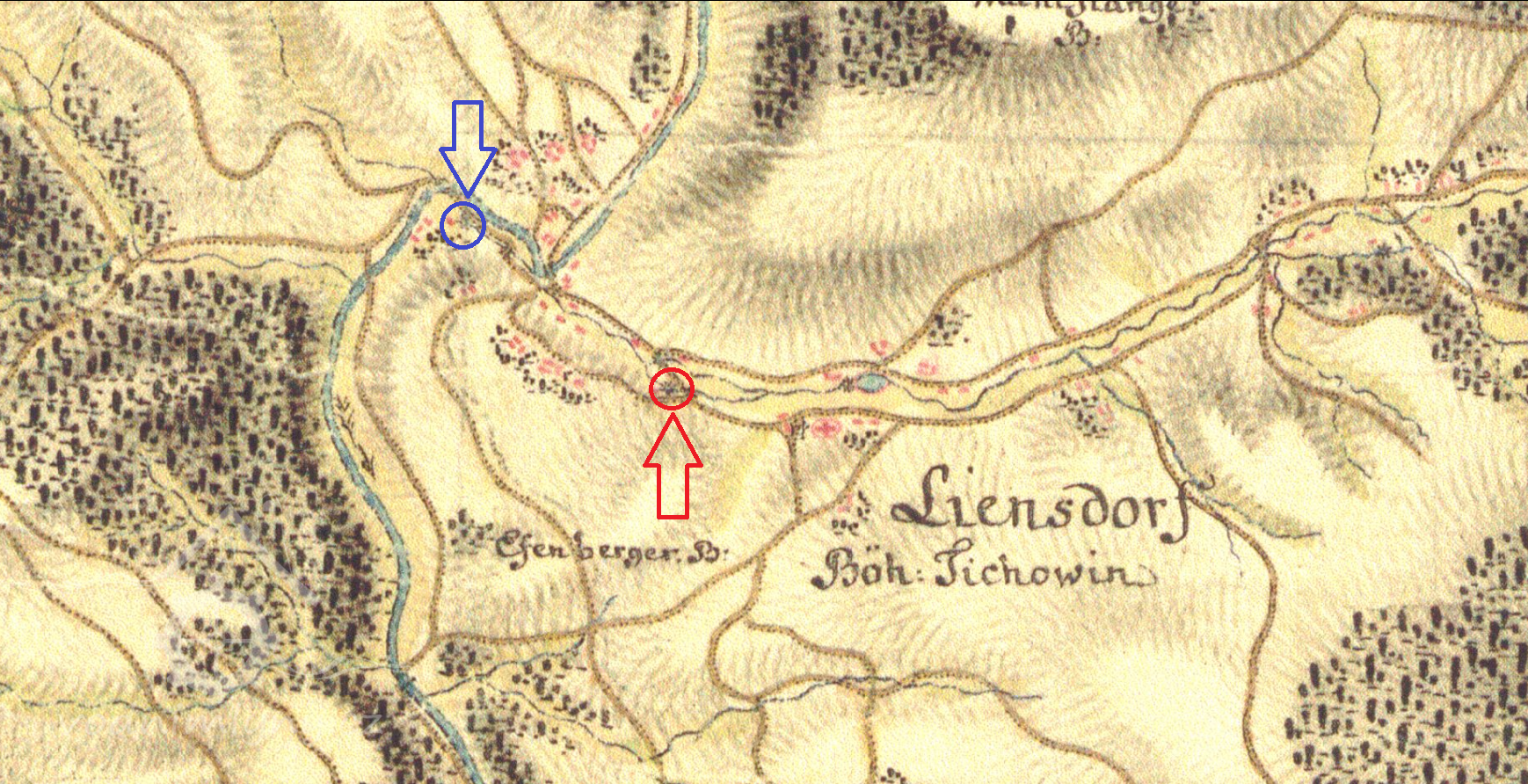 Horní mlýn v Těchoníně, zbořený po odsunu Němců v roce 1948. K mlýnu původně náležely rozsáhlé pozemky na kopci nad ním, nazývaném proto Mlýnský vrch (Mühlberg). Mlýniště dnes zcela zplanýrováno.