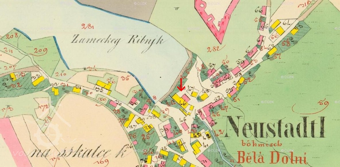 1659 odhad panství bělského: mlýn pod zámkem o 1 kole a 1 soupě, v němž má byt David Šíta. Platí ročně nájmu čistého žita 24 strychů, které počítajíc po 40 groších dají 16 kop a za pšenici 14 kop. Při mlýně je pila pro domácí potřebu, hrubě sešlá, musí se opravit, odhad 30 kop. V obci jsou ještě dva mlýny o 1 kole, oba však jsou pusté.