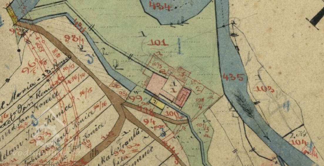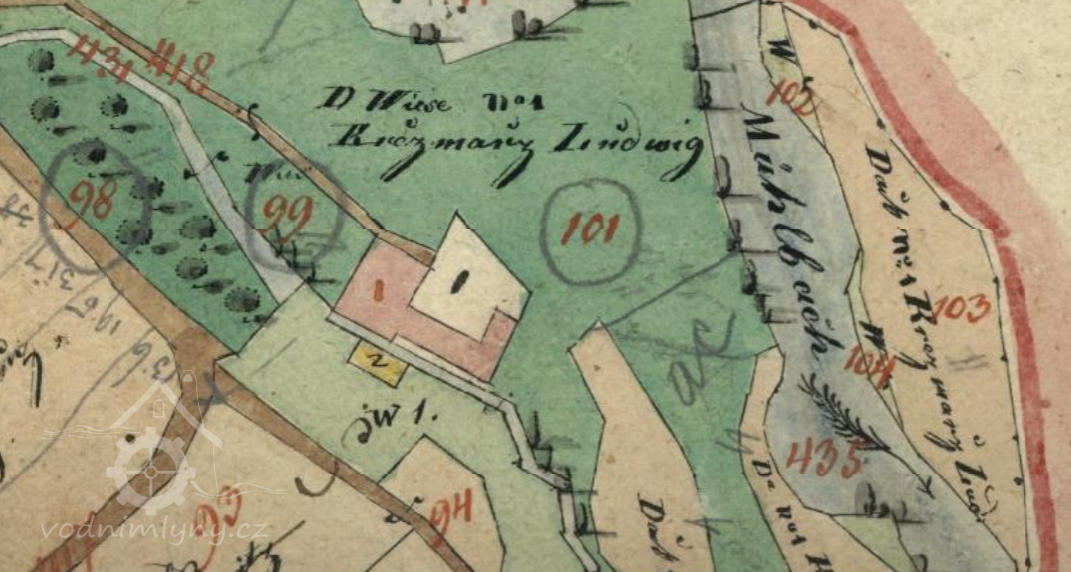 PopisV roce 1930 pohání mlýn a pilu kolo na svrchní vodu s průtokem 0.11 m3/s, spádem 6.16 m o výkonu 6 HP.