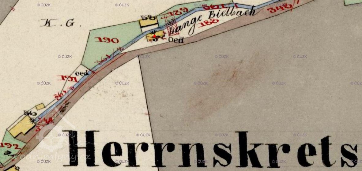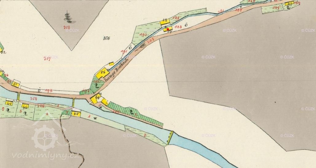Celá čtveřice pil na dřevo (čp. 60, 61, 62, 63) se stejným názvem Brettmühle a označením I. až IV.. byla na horním konci obce na toku Dlouhé Bělé.